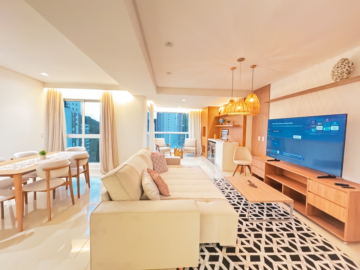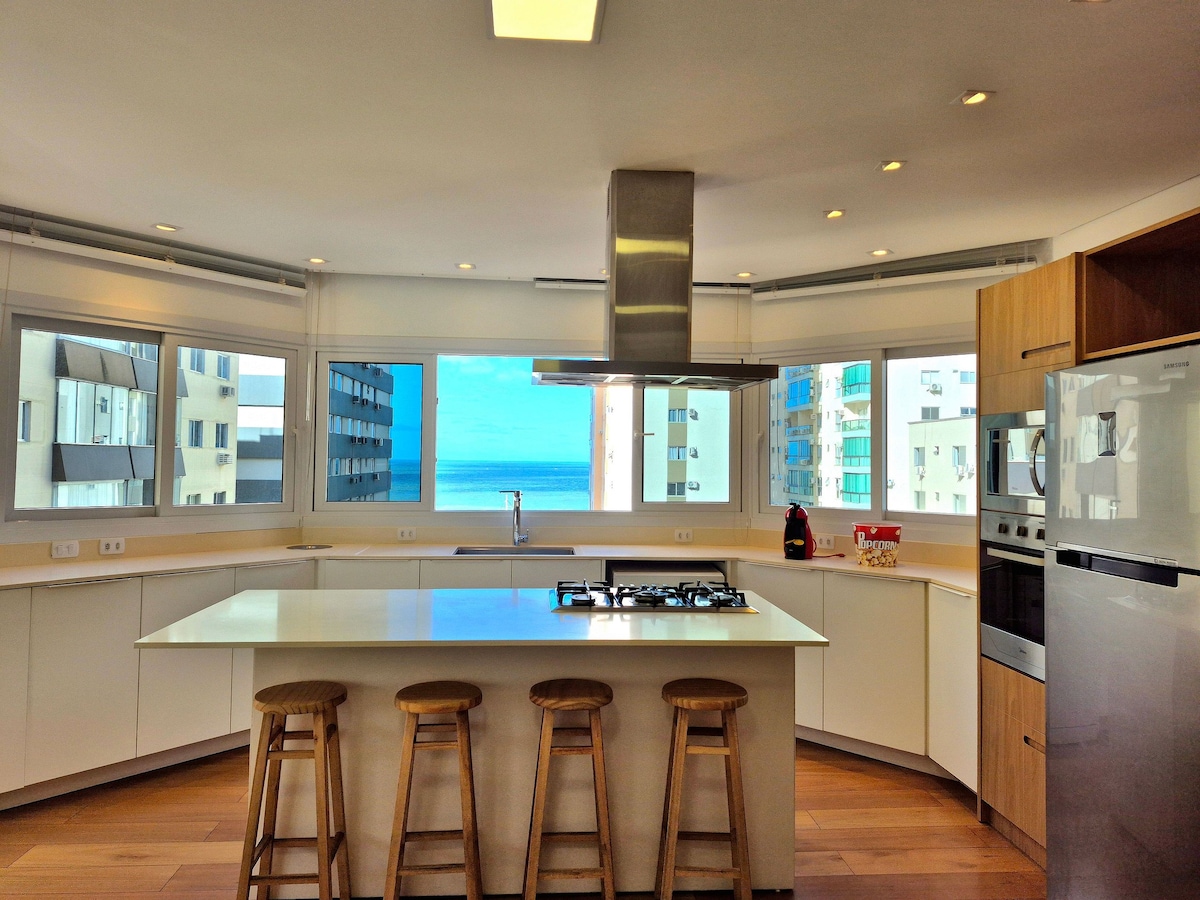 Incredible apartment in Balneário Camboriú, with beautiful views of the entire beachfront. Space with a suite and two bedrooms with private bathroom, large living room, equipped kitchen and balcony facing the sea. Living room and bedrooms recently renovated and air conditioned, high quality mattresses, new furniture and fixtures. Three private and covered parking spaces. We provide bed linen for all beds and one bath towel per guest.