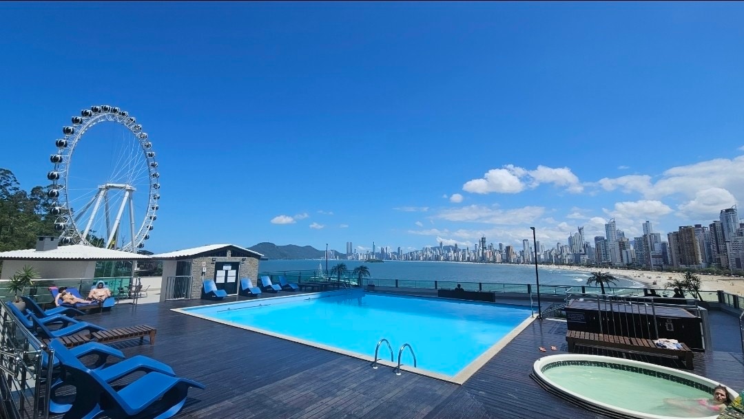 NOVO- RECÉM REFORMADO. Muito conforto, último andar, uma cobertura de revista com uma vista deslumbrante. Decorada com muito requinte e sofisticação. Totalmente equipado, 2 vagas na garagem, 2 piscinas (abertas no verão), 180m2 privativos no 28° andar com a melhor vista de Balneário Camboriú! Telas nas janelas dos quartos, berço e banheira para bebês! Na melhor localização da beira mar, em frente à Ilha, perto dos principais restaurantes da orla. Mercados, padarias e farmácias próximos.