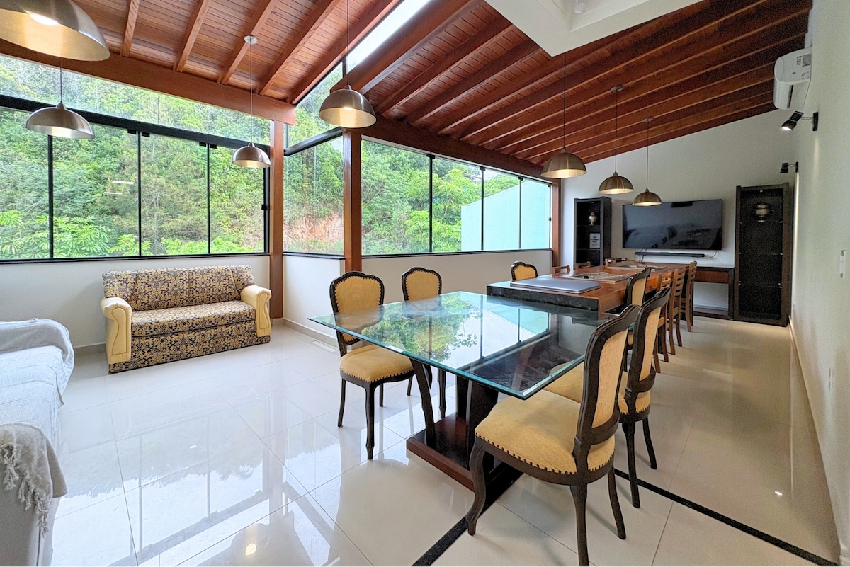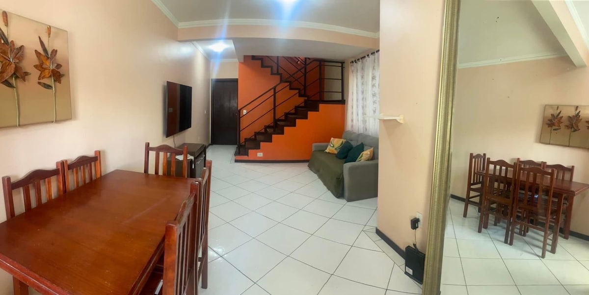 Casa triplex com living integrado com sala de estar, jantar, cozinha e uma área social com Churrasqueira, Mesa de sinuca e Smart TV. Localizada no centro de BC, a apenas 700m da praia (10 min a pé), foi preparada p/ hospedar c/ conforto e comodidade: -4 camas box (3 Queen e 1 Casal) -Ar-condicionado split 3 quartos e sala de TV -Smart TV 65'' living, 55'' suíte principal e 43'' sala de TV -Máquina lava e seca -2 vagas garagem Ideal para receber famílias e grupos de casais!