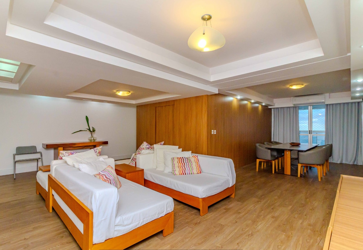 Leia nossas mais de 115 avaliações, todas 5 estrelas! Apto completo para até 6 hóspedes: - 1 suíte+2 quartos (todos c/ ar condicionado e TV, os dois maiores com vista para o mar) - Sala de estar e jantar c/ vista direta para a barra norte - Cozinha e lavanderia totalmente equipadas - Garagem privativa para um veículo médio (*) - Edifício frente ao mar na av. Atlântica com vista total da orla na área comum e portaria 24h - Roupas de cama e banho limpos em lavanderia - Pet friendly