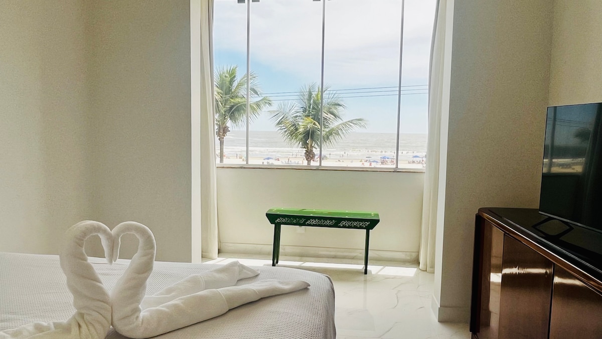 Leia nossas + de 100 avaliações, todas 5 estrelas! Apto completo para até 6 hóspedes: - 1 suíte+2 quartos (todos c/ ar condicionado e TV, os dois maiores com vista para o mar) - Sala de estar e jantar c/ vista direta para a barra norte - Cozinha e lavanderia totalmente equipadas - Garagem privativa para um veículo médio (*) - Edifício frente ao mar na av. Atlântica com vista total da orla na área comum e portaria 24h - Roupas de cama e banho limpos em lavanderia - Pet friendly
