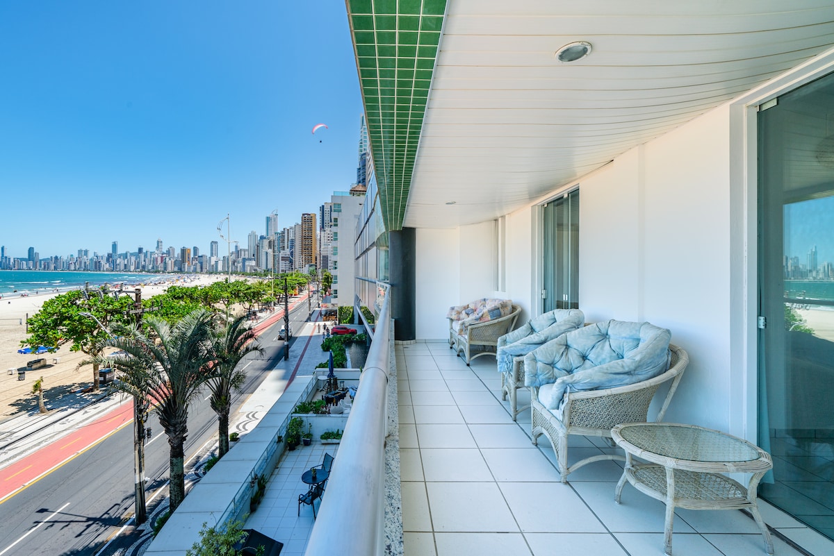 Lindo Apto de frente para o mar na melhor região de Balneário Camboriú! -> Prédio Frente Mar, pé na areia, tudo super perto! -> Roupas de cama inclusas; -> Ar-Condicionado em todos os quartos ; -> Ampla sacada com Vista total da praia; ->Ao lado da nova Orla; -> 2 vagas de garagem; -> Com máquina de lavar, forno, microondas e cafeteira; -> Kit Praia (2 Cadeiras e 1Guarda-Sol); -> 1 Cama Queen, 2 camas boxe de solteiros, 1 Bicama. Obs.:Berço portátil disponível mediante pedido.