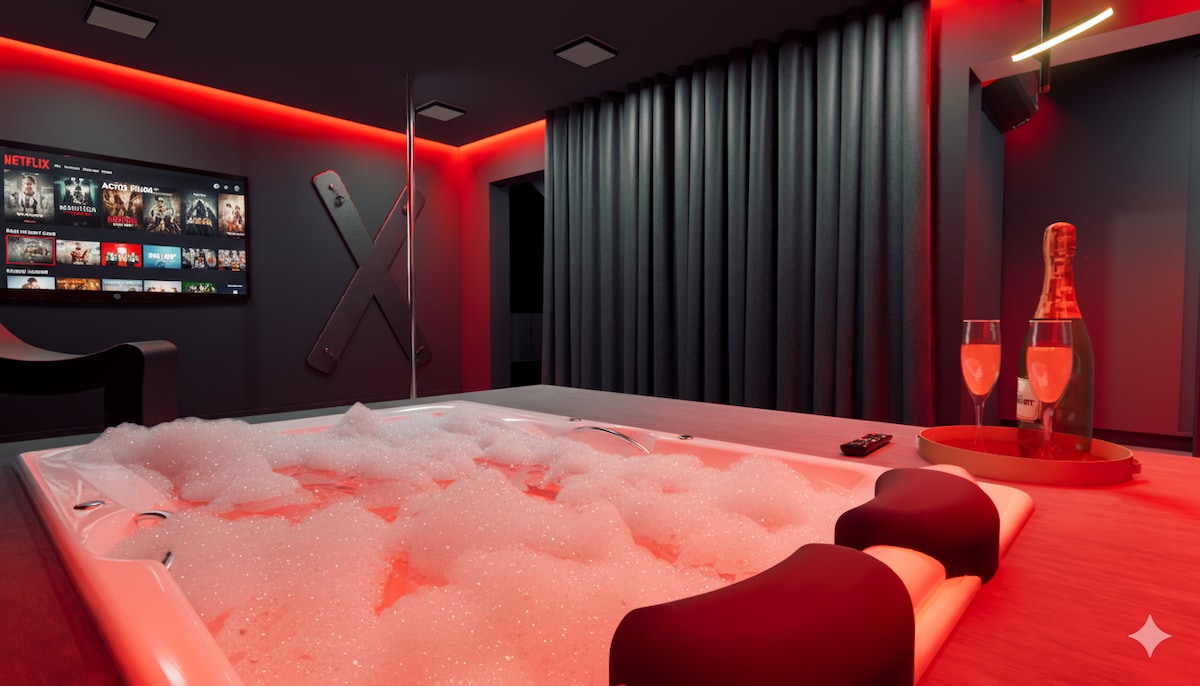 ❤️🔥 Descubra a 1001 Sombras de Amor — Jacuzzi Experience, refúgio sensual no bairro Tabuleiro – Camboriú (SC), a poucos minutos de Balneário Camboriú. 💎 💎Jacuzzi privativa, cama king-size inquebrável, espelho no teto, barra de strip, cruz de St andrée e iluminação envolvente criam o cenário perfeito para libertar o prazer e viver o desejo sem limites. 🎬 70" Cinema virado para a cama com Netflix, Prime Vídeo, Disney+, Spotify. 💋 Aqui, o luxo encontra a paixão — e a imaginação é o limite.