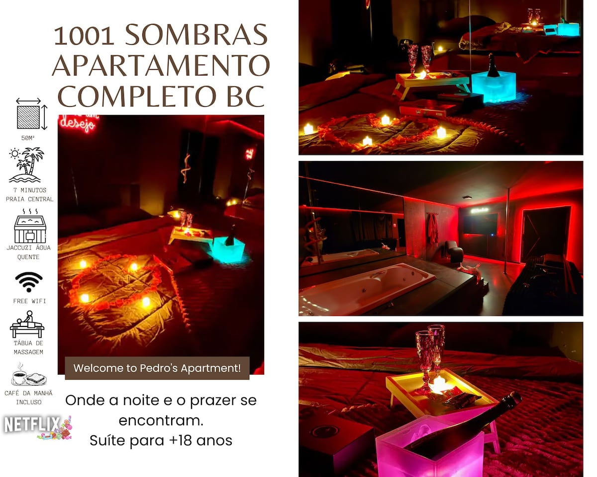❤️🔥 Descubra a 1001 Sombras de Amor — Jacuzzi Experience, refúgio sensual no bairro Tabuleiro – Camboriú (SC), a poucos minutos de Balneário Camboriú. 💎 💎Jacuzzi privativa, cama king-size inquebrável, espelhos , barra de strip, cruz de St andrée e iluminação envolvente criam o cenário perfeito para libertar o prazer e viver o desejo sem limites. 🎬 70" Cinema virado para a cama com Netflix, Prime Vídeo e Youtube. 💋 Aqui, o luxo encontra a paixão — e a imaginação é o limite. A 13/12/2025