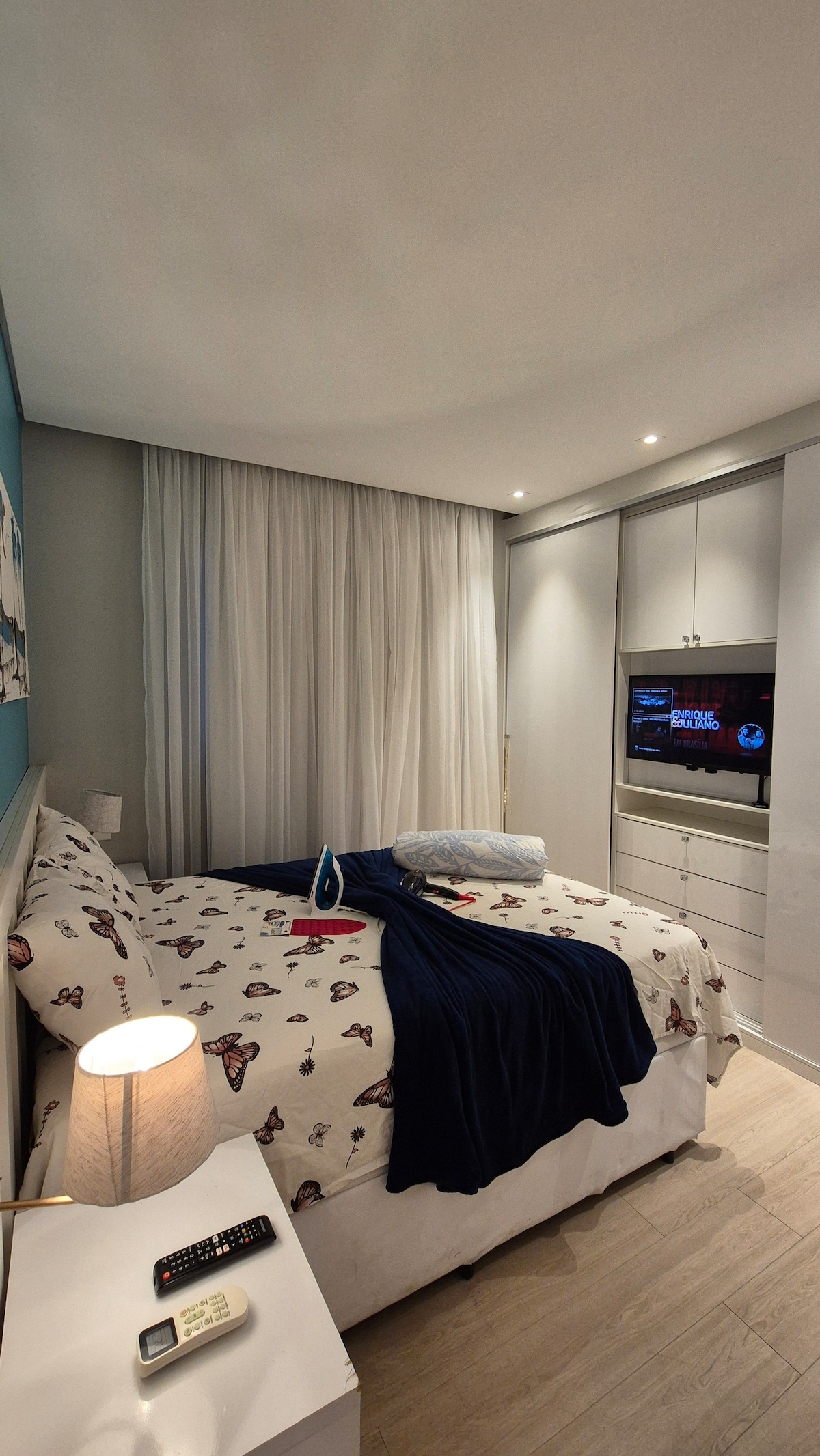 O apto tem um quarto Tipo Estúdio, com Cama Quem, na sala um sofá cama e deixo um colchão avulso, Ele é ideal para Casal com filhos, Cozinha com fogão de indução c 2 bocas, equipado com todos os utensílios Ar condicionado quente e frio no quarto, mas ele aquece ou refrigera o apto tdo, Forneço roupa de cama e Banho, cobertores, O PRÉDIO TEM UMA BOA VAGA DE GARAGEM INCLUSA DENTRO DO PRÉDIO A voltagem da energia em SC é 220vtS