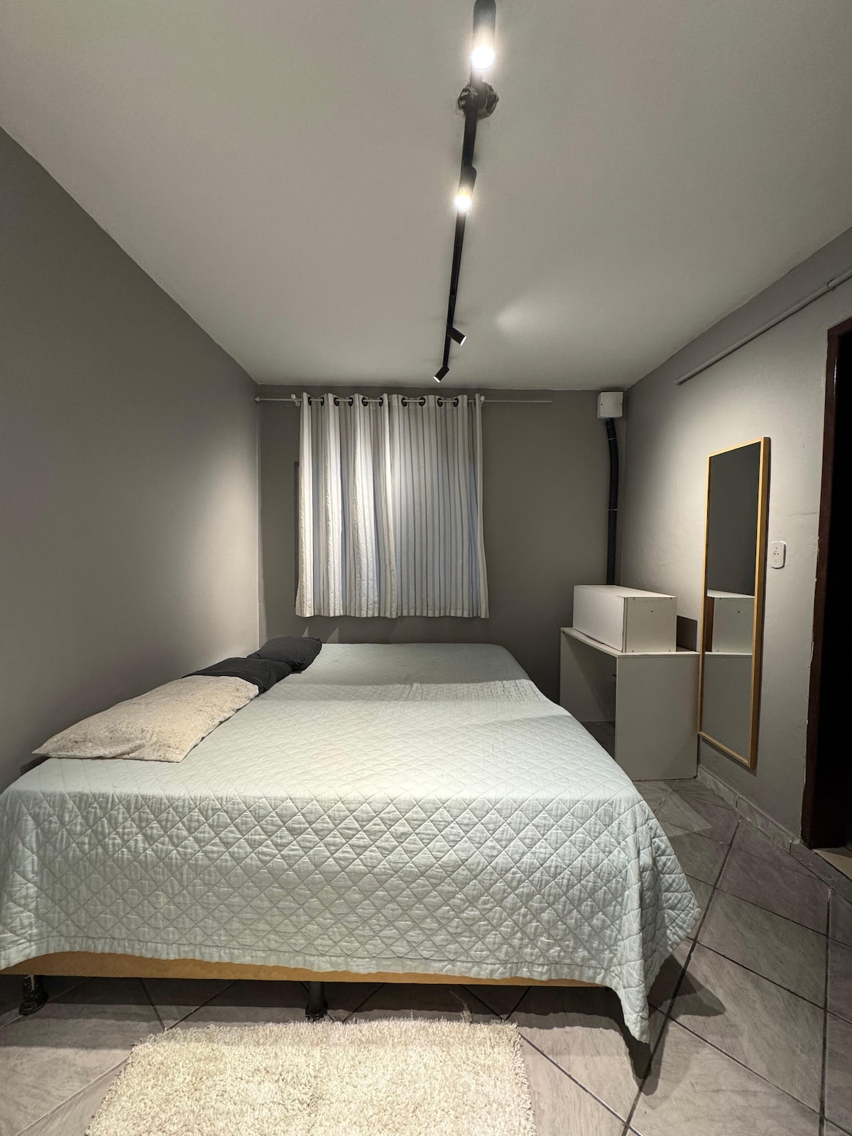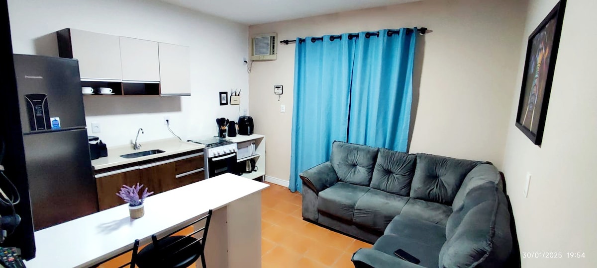 Ambiente independente, amplo e aconchegante, com entrada privada, banheiro exclusivo com banheira, ar-condicionado, secador de cabelo, roupa de cama e banho. A suíte tem cama queen e duas pias. Área externa e cozinha bem equipada e ensolarada. A casa fica a 20min andando da praia (800m), bem próxima do centro comercial. Supermercados de boa qualidade estão bem pertinho. Não temos garagem! A região é tranquila e é possível deixar o carro na rua em frente a casa.