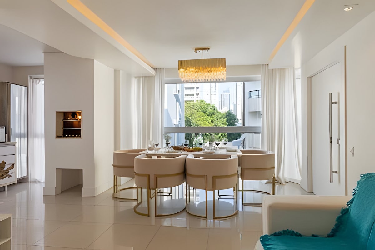 APTO alto padrão com 146 m, 3 suítes, 1 c/jacuzzi, Wi-Fi, Ar condicionado e TV na sala e nas 3 suítes, sacada com churrasqueira, cozinha completa, 2 vagas grandes,lado a lado de garagem para caminhonete, lavanderia, chuveiro a gás, ferro de passar e secador (tomadas 220v), a 600 metros da praia central, na região mais central de Balneário Camboriu, próximo as avenidas principais: Av Brasil e Av Atlantica e Igreja matriz central. Supermercado, farmácias e padaria próximos podendo fazer tudo a pé.