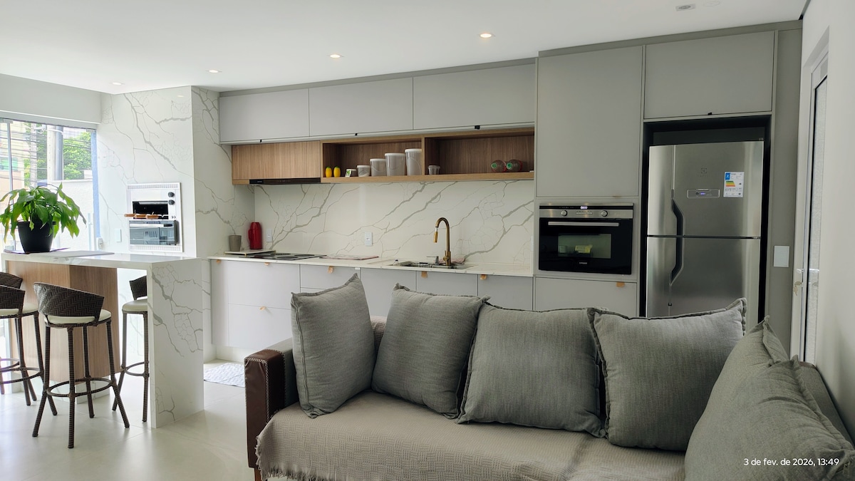 Apartamento novo e moderno, no centro de Balneário Camboriú, na rua do Passeio San Miguel e Aquário. 2 suítes com colchões premium de hotelaria, blackout 100%, duchas e torneiras a gás e ar-condicionado quente/frio. Sacada com churrasqueira automatizada a carvão. Cozinha e lavanderia totalmente equipadas. 2 vagas de garagem. Distância de 750 metros da praia central (10 min caminhando). Perto de mercado, restaurantes, bares, cafés, shopping, farmácia e comércio.