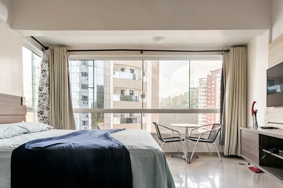 Sinta- se em casa e viva bons momentos em BC neste espaço aconchegante e equipado.Tudo conforme as fotos, localização privilegiada e, com essa incrível vista, da estrada da rainha, e fácil acesso à Praia Brava- Itajaí. E ainda conta uma área de lazer com piscina, vista para a praia e roda gigante . 1 vaga na garagem gratuita . Lavanderia ( * terceirizada ) . Portaria 24 horas. Elevadores . Check-in a qualquer momento após as 15:00 e check-out a qualquer momento antes das 12:00.