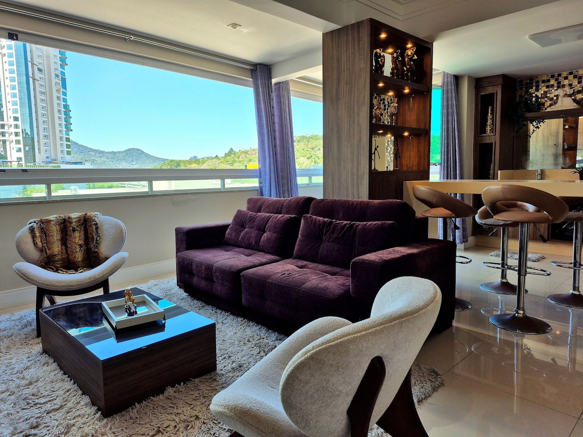 NOVO- RECÉM REFORMADO. Muito conforto, último andar, uma cobertura de revista com uma vista deslumbrante. Decorada com muito requinte e sofisticação. Totalmente equipado, 2 vagas na garagem, 2 piscinas (abertas no verão), 180m2 privativos no 28° andar com a melhor vista de Balneário Camboriú! Telas nas janelas dos quartos, berço e banheira para bebês! Na melhor localização da beira mar, em frente à Ilha, perto dos principais restaurantes da orla. Mercados, padarias e farmácias próximos.