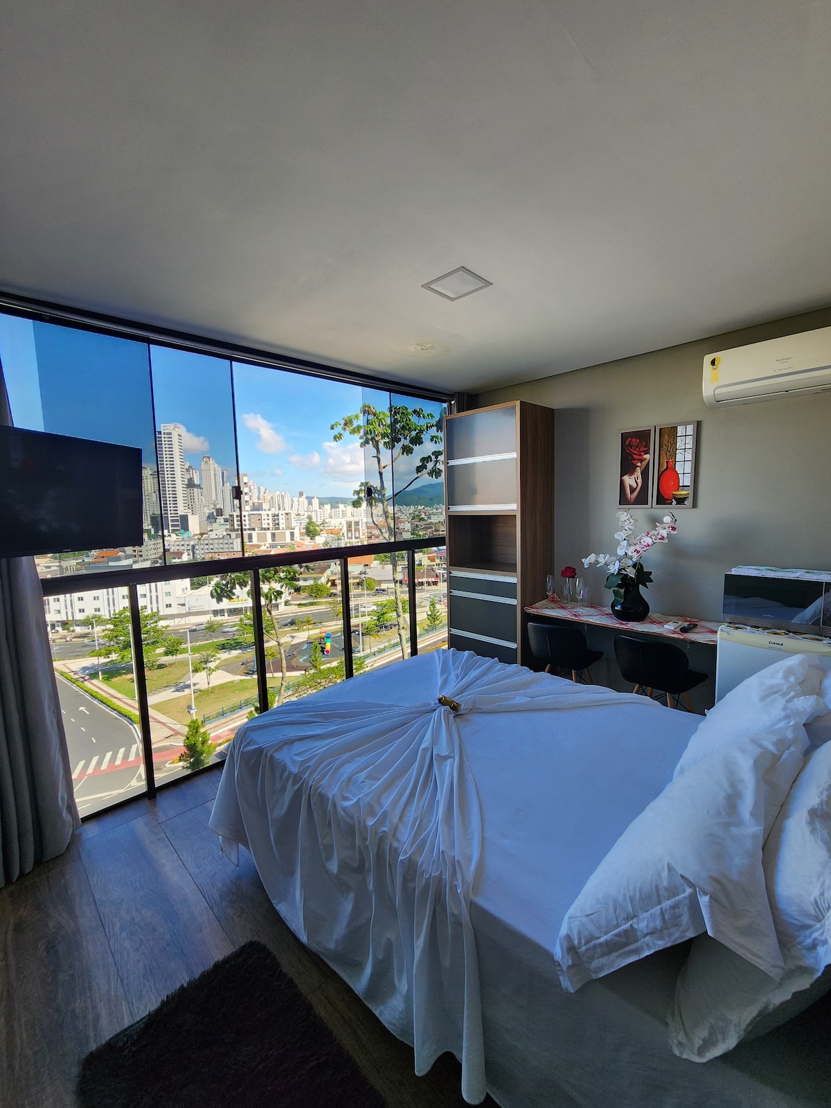 Hospede-se a poucos metros da praia Central de Balneário Camboriú e próximo das principais atrações da cidade. O quarto foi planejado para até 2 pessoas, com o básico para viver uma experiência de curta duração. O espaço conta com: Cama box casal Poltrona, mesa de trabalho e cadeira TV de tela plana 32" com canais a cabo Ar-condicionado split Cofre digital Frigobar Secador de cabelo O condomínio oferece área de lazer com piscinas, saunas e jacuzzis. Estacionamento não disponível.