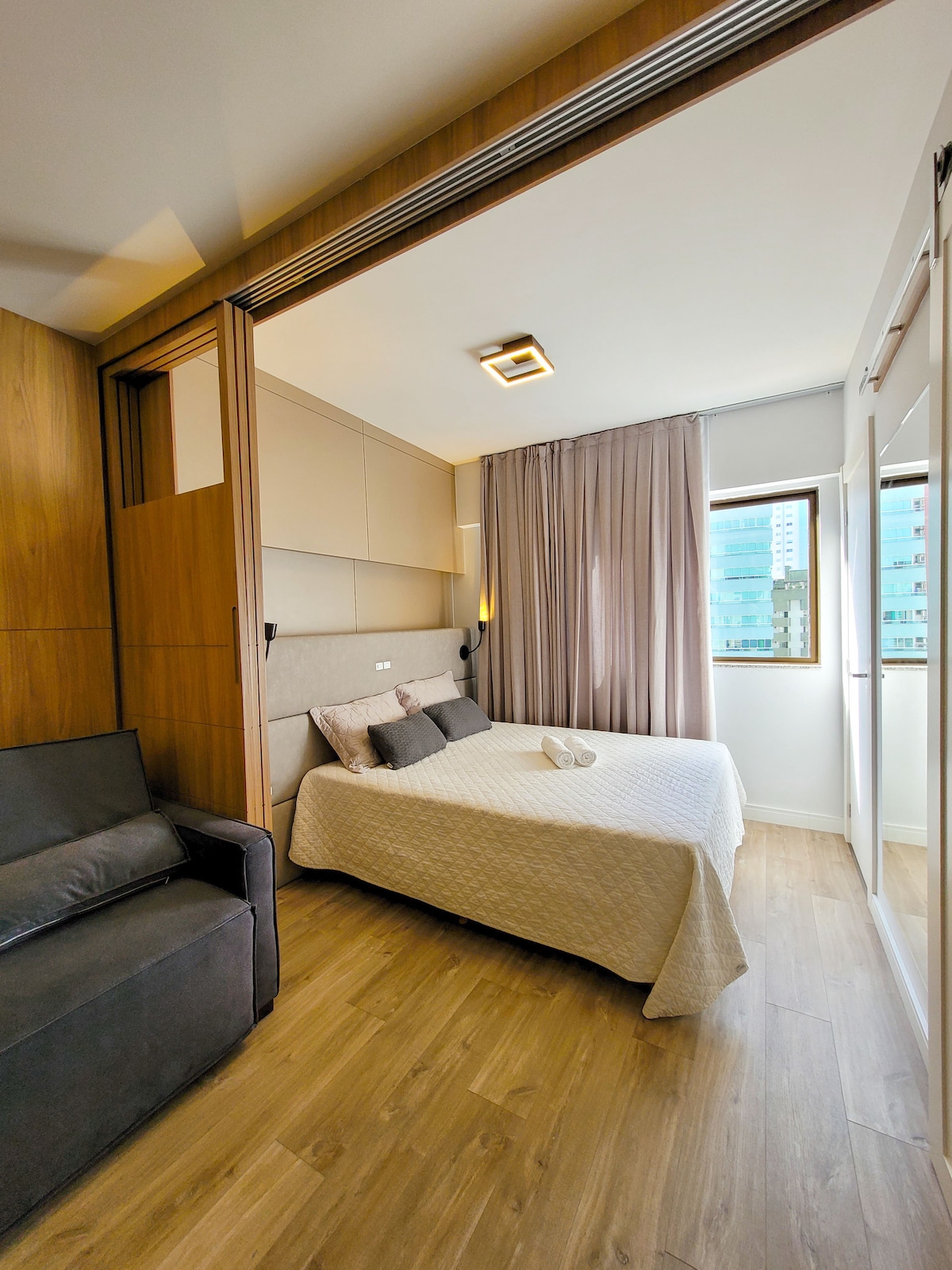 Com uma localização ótima, o Studio está localizado a apenas 2 quadras do mar. Um espaço prático, com tudo que você precisa: TV LED, ar-condicionado, frigobar, internet Wi-Fi, cofre, louças e talheres, forno micro-ondas e secador de cabelos. Possuí também as comodidades de um hotel: duas piscinas externas de mergulho, uma piscina interna aquecida, duas hidromassagens, sauna seca e úmida e sala de jogos. Próximo ao Shopping e comércio. 5 minutos de distância da Praia Central.