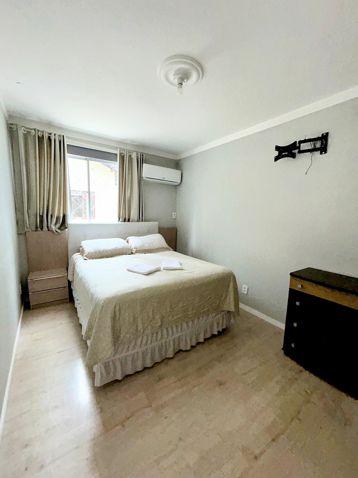 Lugar aconchegante, a 2min do mar. Estacionamento não demarcado (1 carro médio ex: Tracker), não é gaveta. Kit praia: cooler, 2 cadeiras, guarda-sol. Cozinha equipada com utensílios, purificador de água, geladeira, forno, fogão de indução, micro-ondas, ferro, chaleira elétrica. Cozinha integrada com a sala com smart TV e sofá cama King 1 quarto com 1 Cama queen, 2 colchões de solteiro e mini berço opcional 1 banheiro completo Cortinas blackout, ar cond. frio na sala e quarto, aquecedor elétrico