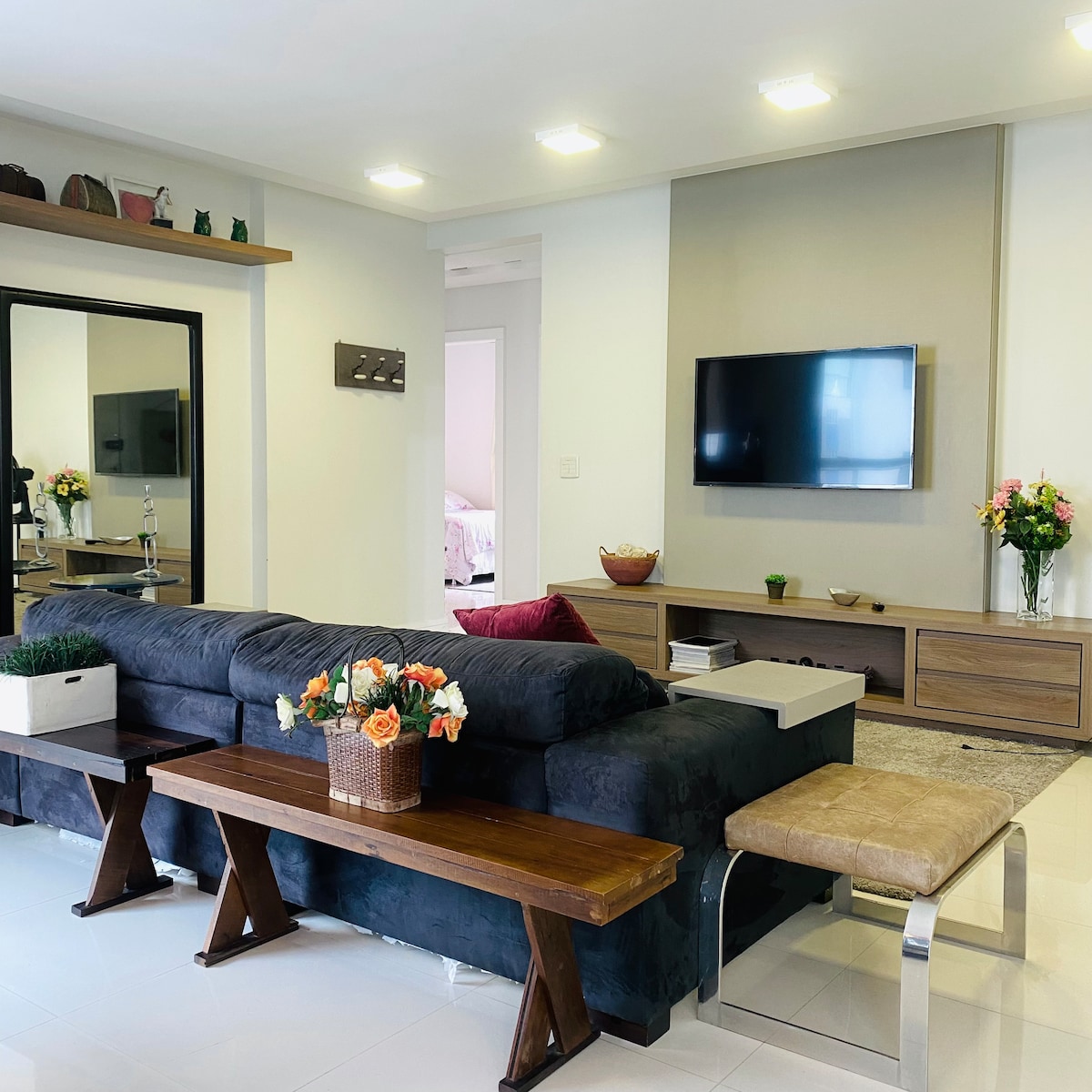 Lindo Apartamento a 30 metros da Praia, com Vista para o Mar e Cidade, amplo, ventilado, climatizado, equipado, REDE DE PROTEÇÃO nas janelas e na sacada.Sala de estar com Tv, Sala de Jantar com churrasqueira, Cozinha com espaço para refeição, espaços amplos e integrados permitindo interação entre os hóspedes. A Sacada tem vista para o Mar e cidade, com mesa e cadeiras, oferecendo momentos incríveis: tomar café, happy hour, trabalho. Ar condicionado nos quartos. 2 GARAGENS INDIVIDUAIS
