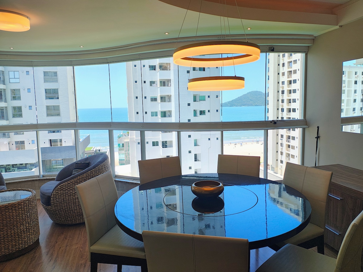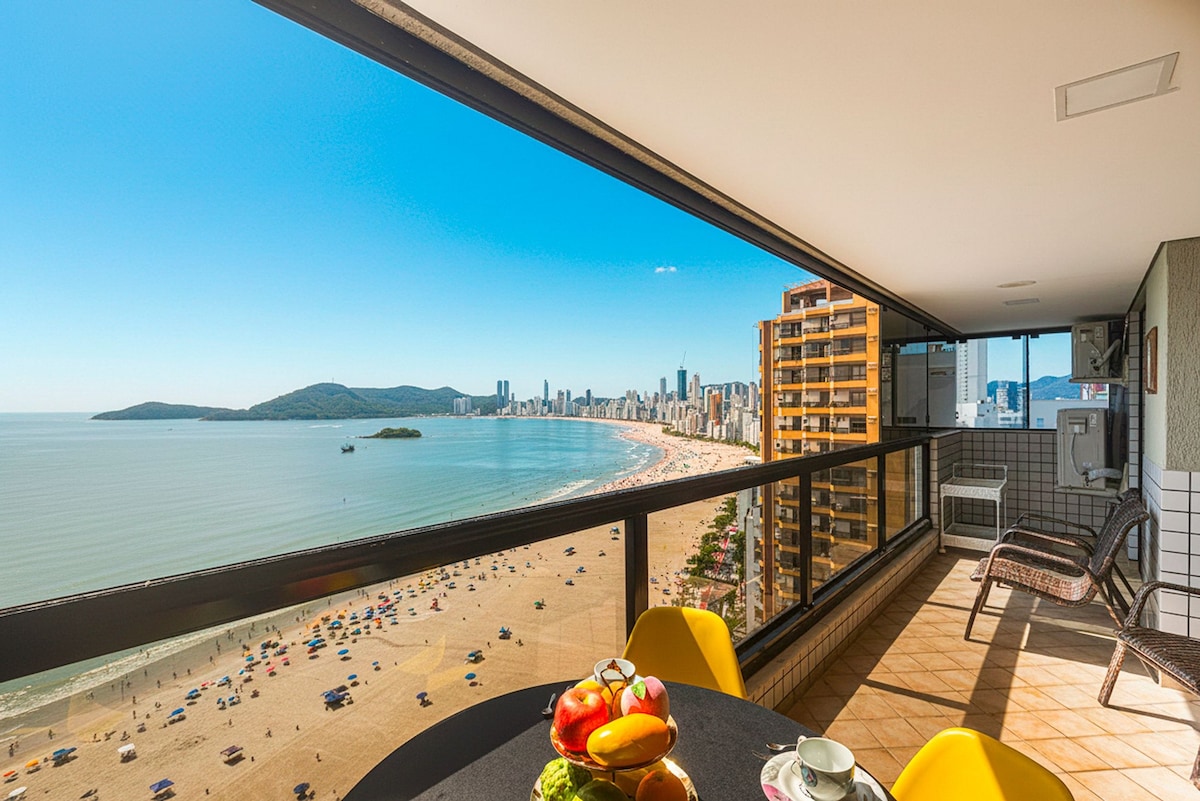 NOVO- RECÉM REFORMADO. Muito conforto, último andar, uma cobertura de revista com uma vista deslumbrante. Decorada com muito requinte e sofisticação. Totalmente equipado, 2 vagas na garagem, 2 piscinas (abertas no verão), 180m2 privativos no 28° andar com a melhor vista de Balneário Camboriú! Telas nas janelas dos quartos, berço e banheira para bebês! Na melhor localização da beira mar, em frente à Ilha, perto dos principais restaurantes da orla. Mercados, padarias e farmácias próximos.