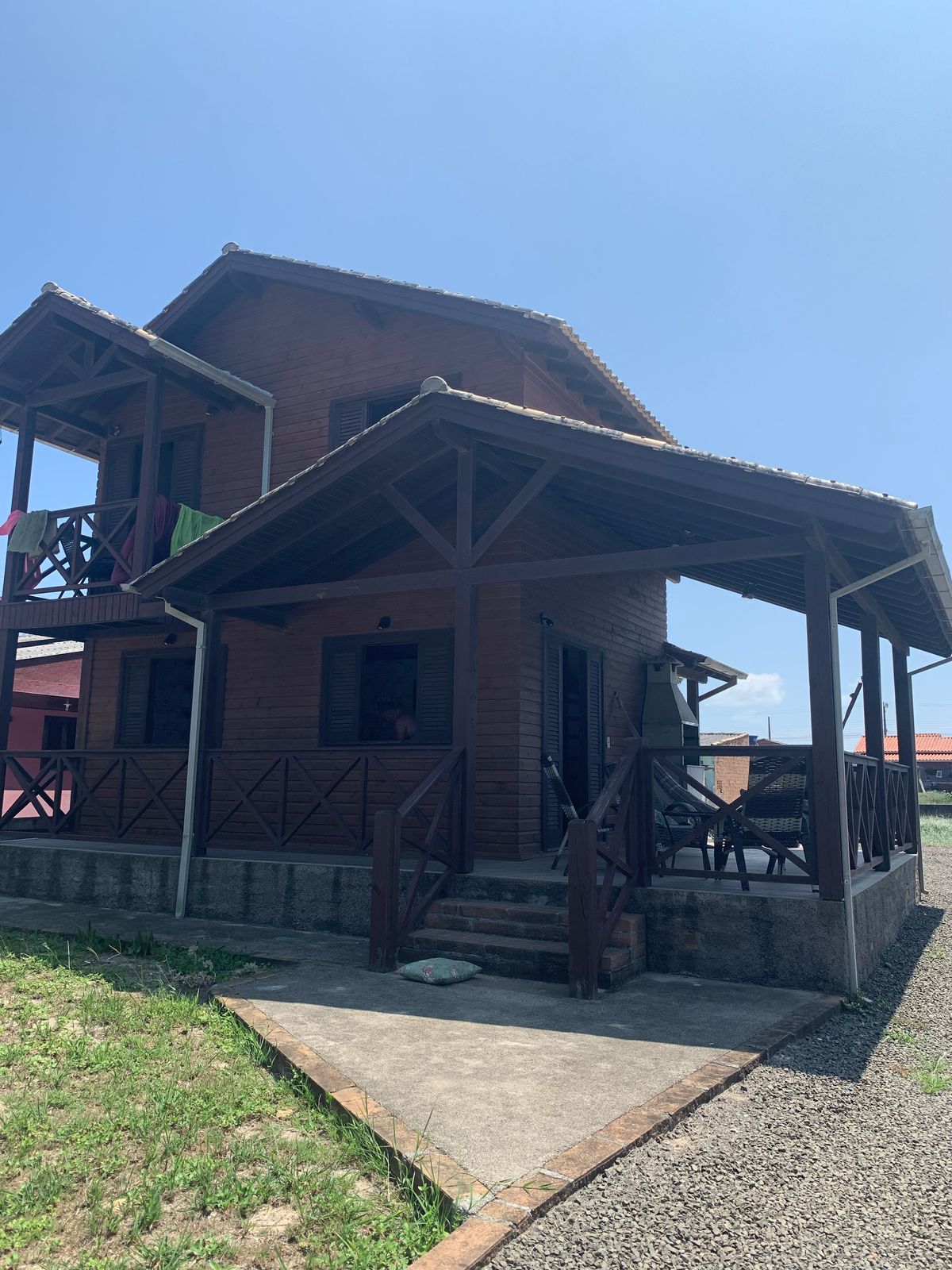 O chalé possui 2 pisos com dois quartos na parte superior e uma sacada com vista para o Mar. Conta com cozinha completa, louças, geladeira, fogão, churrasqueira. Uma cama de casal e uma beliche, possui colchão extra (1 de casal). Mesa com 6 cadeiras. Mesa com cadeiras na varanda, assim como uma mesa de plástico com 4 cadeiras de apoio para churrasco. Com exceção das bebidas de decoração, qualquer item da casa pode ser utilizado. Há móveis nos quartos para organização de roupas.