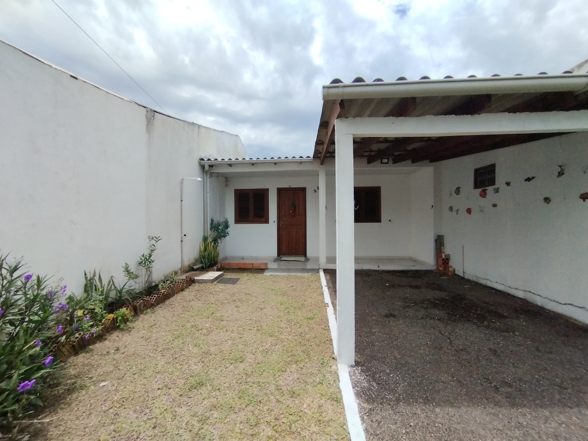 quarto 1 com uma cama de casal e uma de solteiro, quarto dois com uma cama de casal, na sala dois sofas que abrem e viram cama de casal, pátio amplo com churrasqueira campeira de tijolos no chão, local e familiar tranquilo com ótima vizinhança silenciosa de forma que não se Coloca som alto, 15/20 minutos de caminhada para chegar ao centro, casa totalmente mobiliada, precisa levar forro de cama e travesseiro.