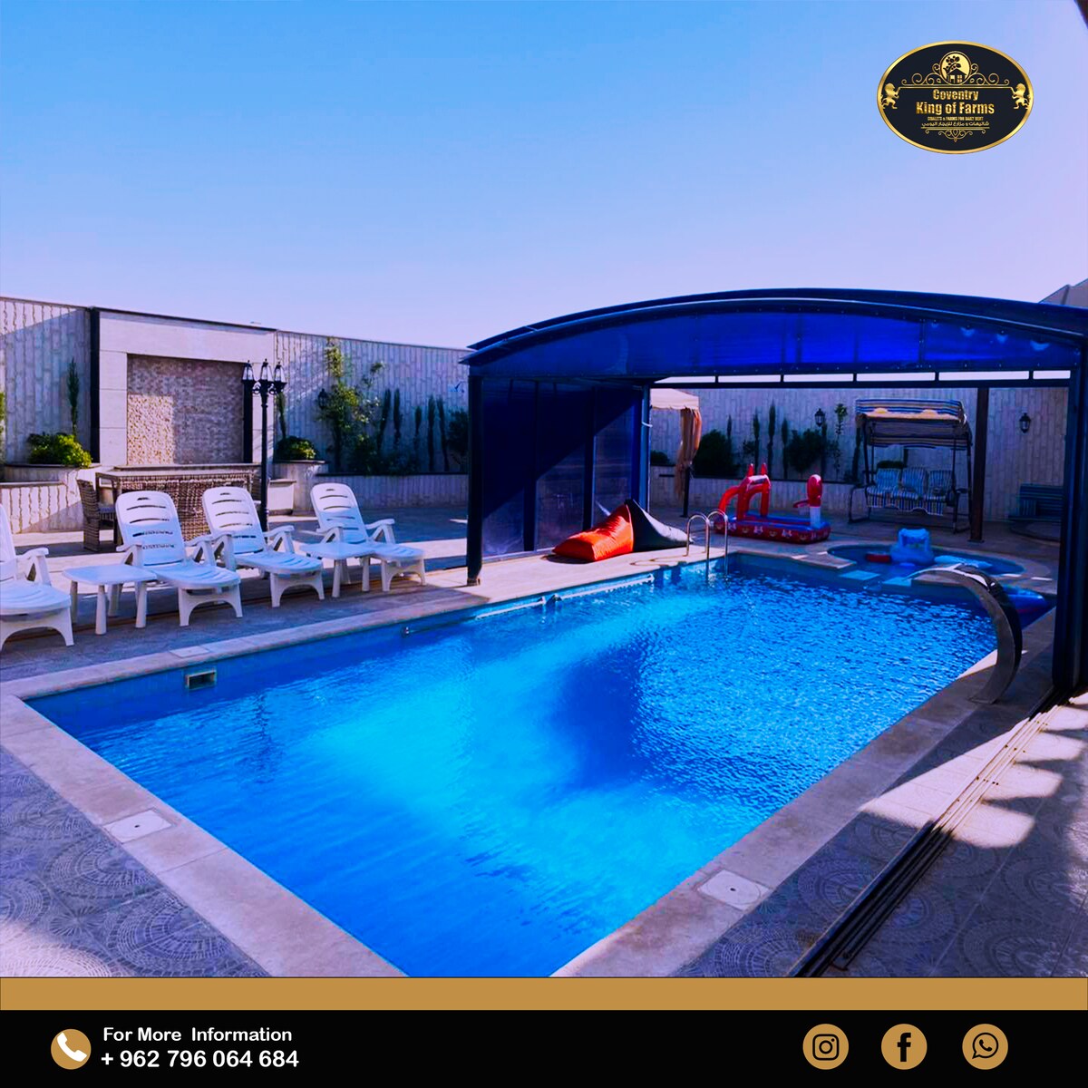The outdoor area includes a BBQ, poolside seating, a slide, dining table. Everything you need for an unforgettable stay is here! Book now for the perfect getaway!