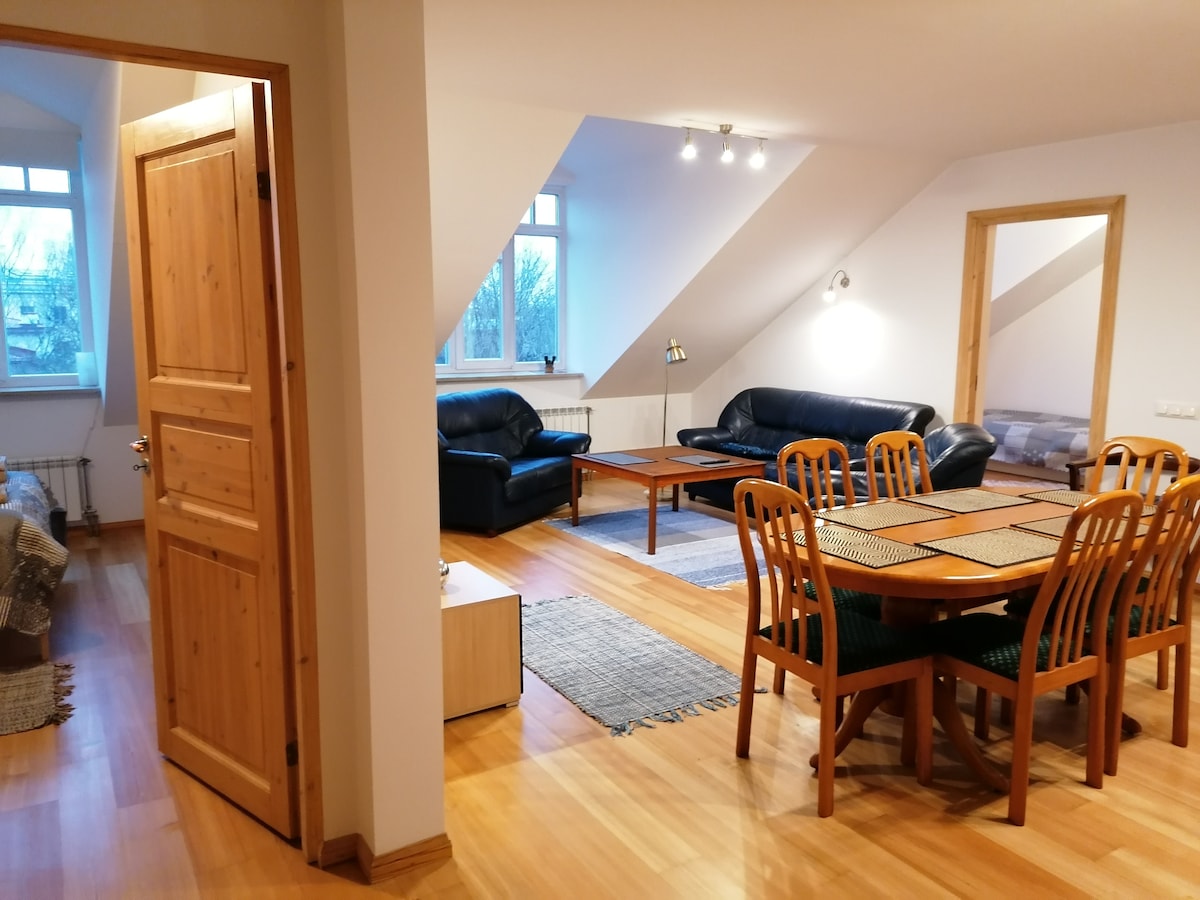 Enjoy a spacious 60m2 2-room apartment with a fully equipped kitchen. Free parking in the closed yard and a nearby bus stop provides easy access to all parts of the city. The apartment is located on the fourth floor. Please note that the building unfortunately does not have an elevator. Old Town is a 15-minute walk, shopping mall only 10 minutes on foot. Home office essentials. Large jacuzzi – fun for kids or for unwinding with a romantic evening relaxation for two.