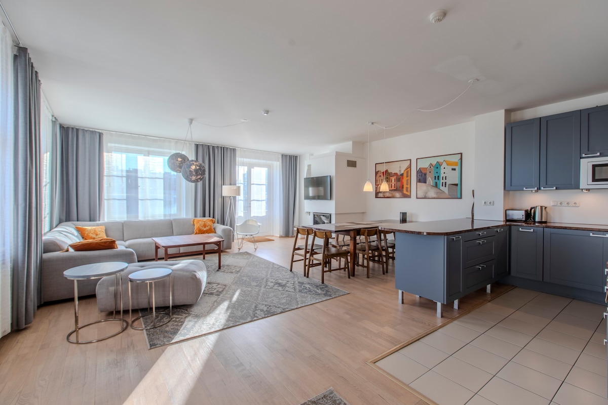 Luxurious 82 m2 apartment in the heart of the city. The light-colored apartment is very bright. The view is to the old town and the sea. 2 bedrooms and spacious living area with kitchen. Sleeping places for up to 6 people. Interior is modern, includes all amenities. Bathroom and sauna with sea view. The toilet is separately. The best location in Tallinn. The Old Town and the seaside are right next door. The restaurant district Telliskivi is a 10-minute walk away. Tram stop is 200 m away.
