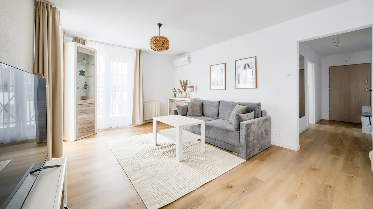 Zapraszamy do luksusowego apartamentu który łączy w sobie nowoczesność i klasyczną elegancję. Przestronny salon z aneksem kuchennym urządzony jest z dbałoscią o każdy detal. Jasne kolory i eleganckie meble tworzą wyjatkową atmosferę relaksu i komfortu. Znajdziesz tu wszystko czego potrzebujesz od płyty indukcyjnej przez piekarnik pralkę aż po zmywarkę. Przytulna sypialnia z łożem małżeńskim zapewni komfortowy sen. Gustownym uzupełnieniem apartamentu jest nowoczesna i funkcjonalna łazienka