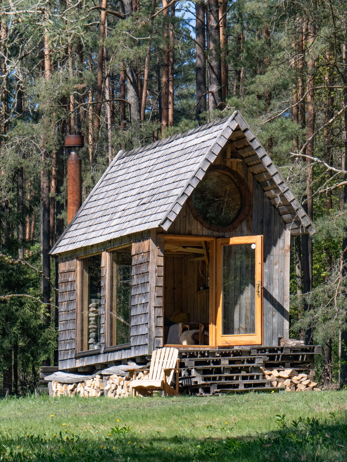 Tikai 25 min attālumā no Vecrīgas pieejama rāma atpūta ārpus pilsētas rāmjiem. Meža ieskautajā namiņā būs iespēja paslēpties no ikdienas steigas, klausoties meža un putnu skaņās, relaksējoties vannā ar skatu uz dabu, skatoties zvaigznēs no baļļas, baudot nesteidzīgas brokastis uz plašās terases vai lasot grāmatu guļamtīklā. Apartamentos pieejams arī grils, pilnībā aprīkota virtuve, ugunskura vieta uz terases, kamīns un siltumsūknis komforta cienītājiem. Lielupes peldvieta 800m. Jūrmala 10 km.