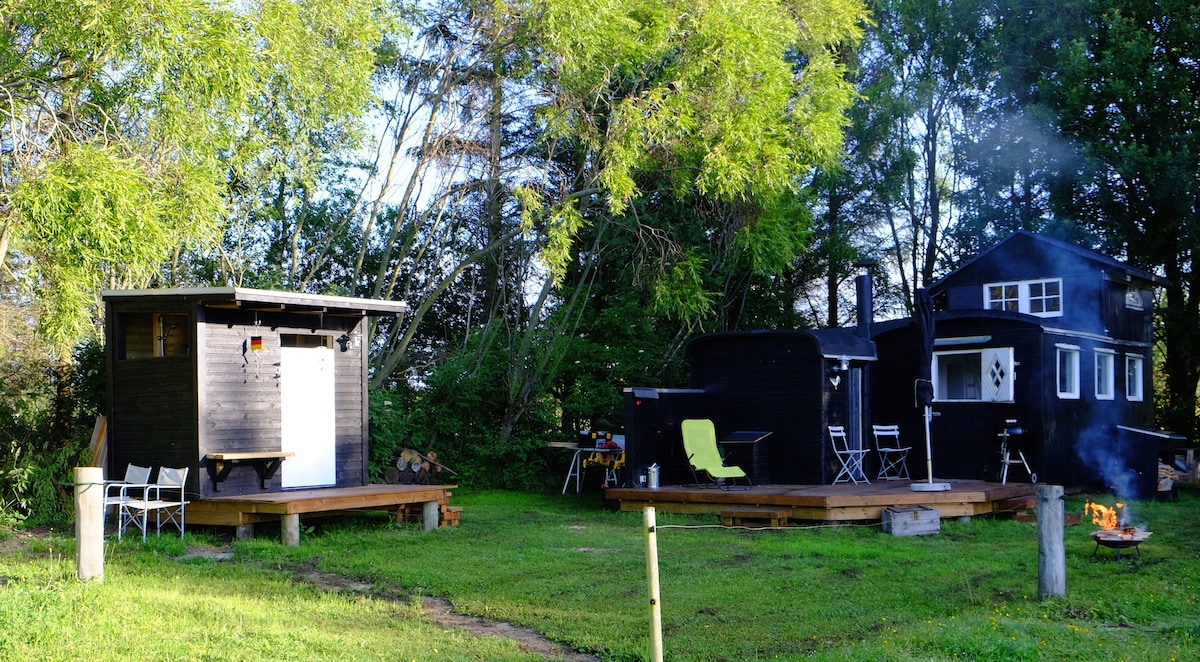 Old circus wagon from 1920 - Totally restored. Very romantic place in middle of nature with horses around - and a really nice view over the fields. Make a fire in the evening or barbecue on the terrace. New kitchen, toilet and shower facilities.