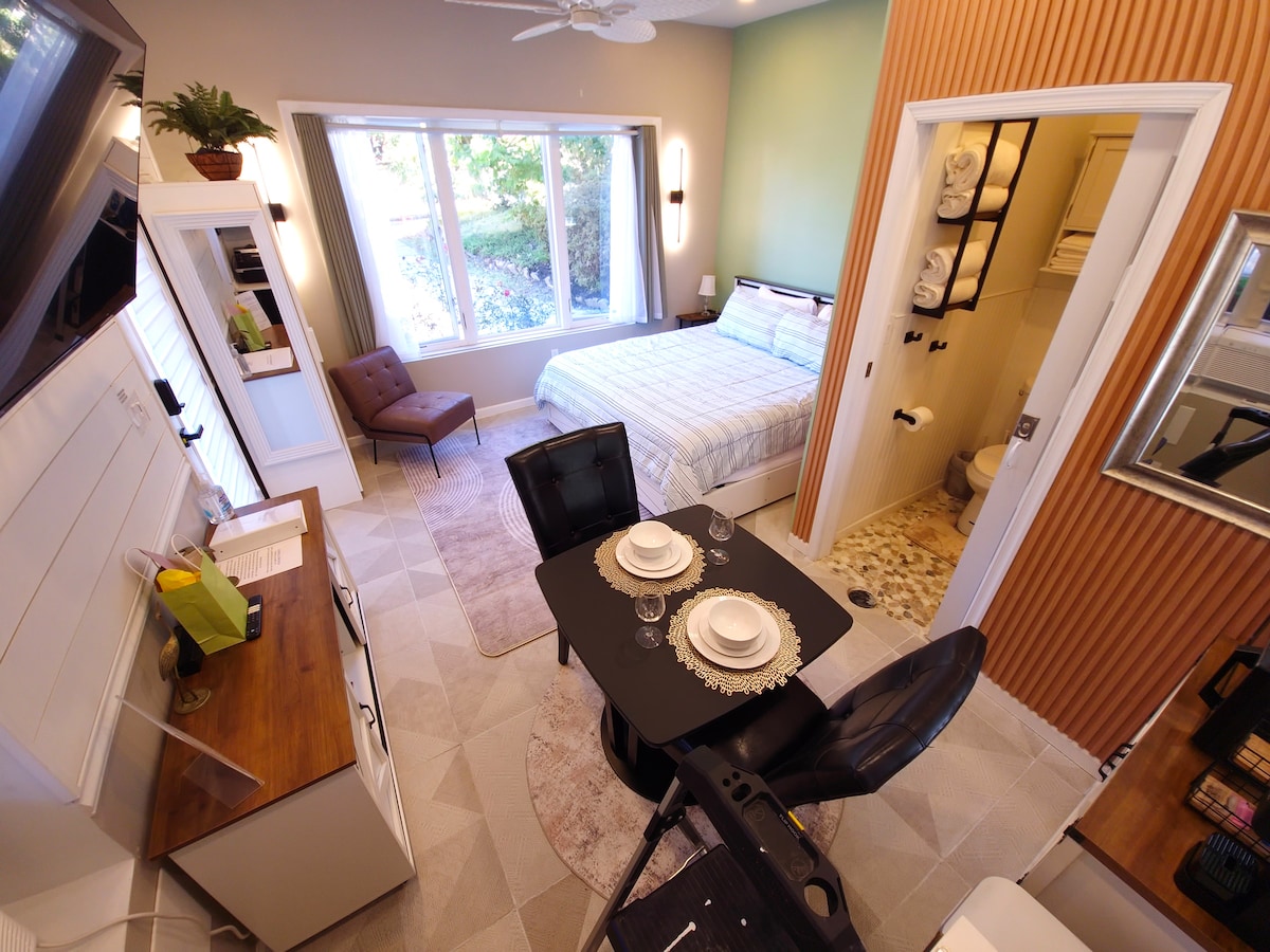 Newly renovated, immaculate two room tiny home. A stand-alone gem nestled against a wooded backdrop - well back from the main home - and wrapped in a huge, teak-furnished, blue stone patio with fire pit situated in a sunny opening in the mature tree canopy. Super comfy queen Murphy bed offers easy conversion of the well lit and modern main living space from living room & kitchen by day to main sleeping quarters at night. The adjoining room is a well appointed full bath and dressing area.