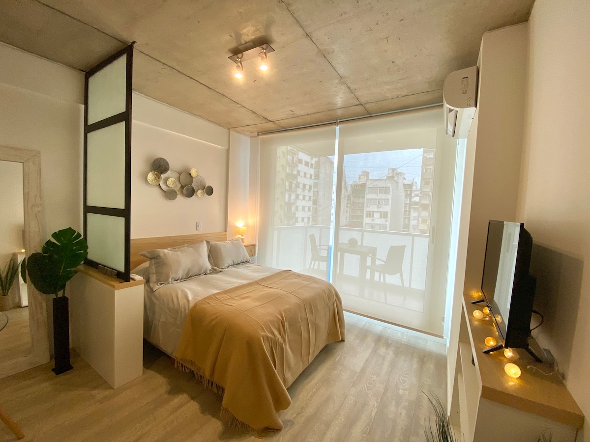 Amplio studio luminoso equipado y pensado únicamente para huéspedes de cortas y largas estadías. El depto cuenta con wifi 300 megas apto para uso profesional (trabajo remoto) una cómoda mesa para trabajar, cenar, almorzar al igual que la barra y/o desayunador. Tv smart con cable y disponible para usar netflix con tu cuenta. Dos opciones de cortinas en el dormitorio, black out (oscuridad total) y screen (translucidas) balcon amplio con mesa y sillas para almorzar/cenar o trabajar al aire libre!