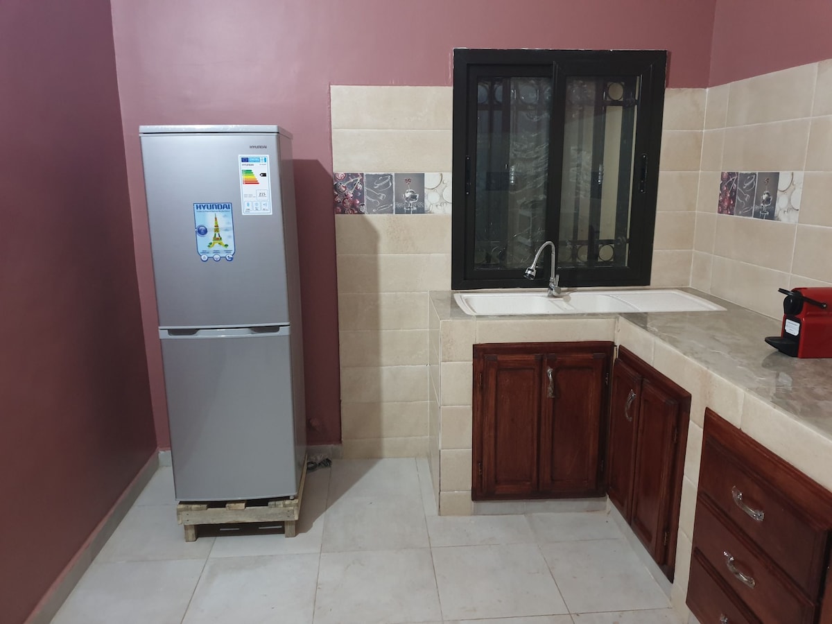 Ce logement familial situé dans un secteur stratégique et proche de toutes commodités. Villa composé de 3 chambres avec toilettes et douches. Piscine extérieur, parking privé,wifi gratuit,gardien 7j/7, machine à laver, cuisine équipée, et une très belle terrasse idéal pour vos BBQ en pleine air. À la charge du client: l'électricité ( service de compteur prépayé), ménage, canal+ (TV smart disponible) et gasoil du groupe électrogène. Nous privilégions les longs séjours.