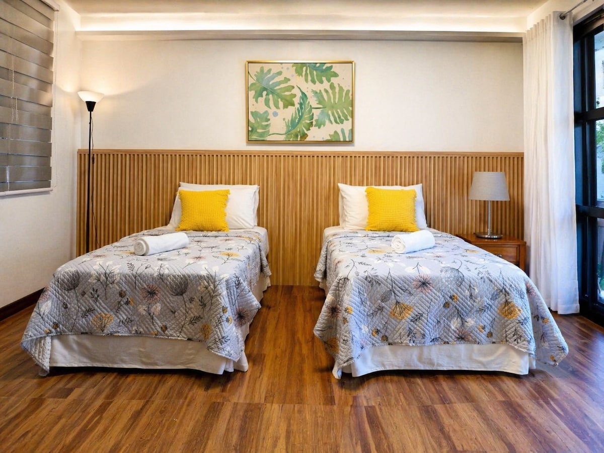 Sampaguita Room 2 offers a warm and inviting retreat, featuring a Filipino-inspired design complemented by soothing earthy tones. Sunlight gently fills the space through large windows, providing relaxing garden views, while the high wooden ceilings add an airy and comfortable ambiance. The room is equipped with cozy twin beds, thoughtfully curated décor, and a private CR and T&B—making it an ideal choice for couples, friends, or small families looking for a peaceful and comfortable stay.