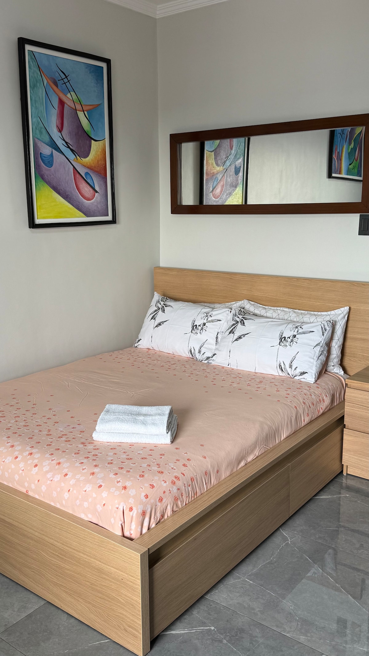 Angelic Premier Residences is close enough to SM, Korea town, restaurants & bars, but far enough that it's not too noisy. The building has gym, 24-hour rooftop pool, and a sports bar with a billiards table. There is common parking in front of the condo on a 1st come 1st serve basis + additional parking lot across the street. This is a fully-fitted 1-bedroom apartment with easy check-in, 2 x Netflix TVs, 200Mbps Fibre Optic Internet, 1 x King-size bed, one fold-up single bed and a comfy couch!