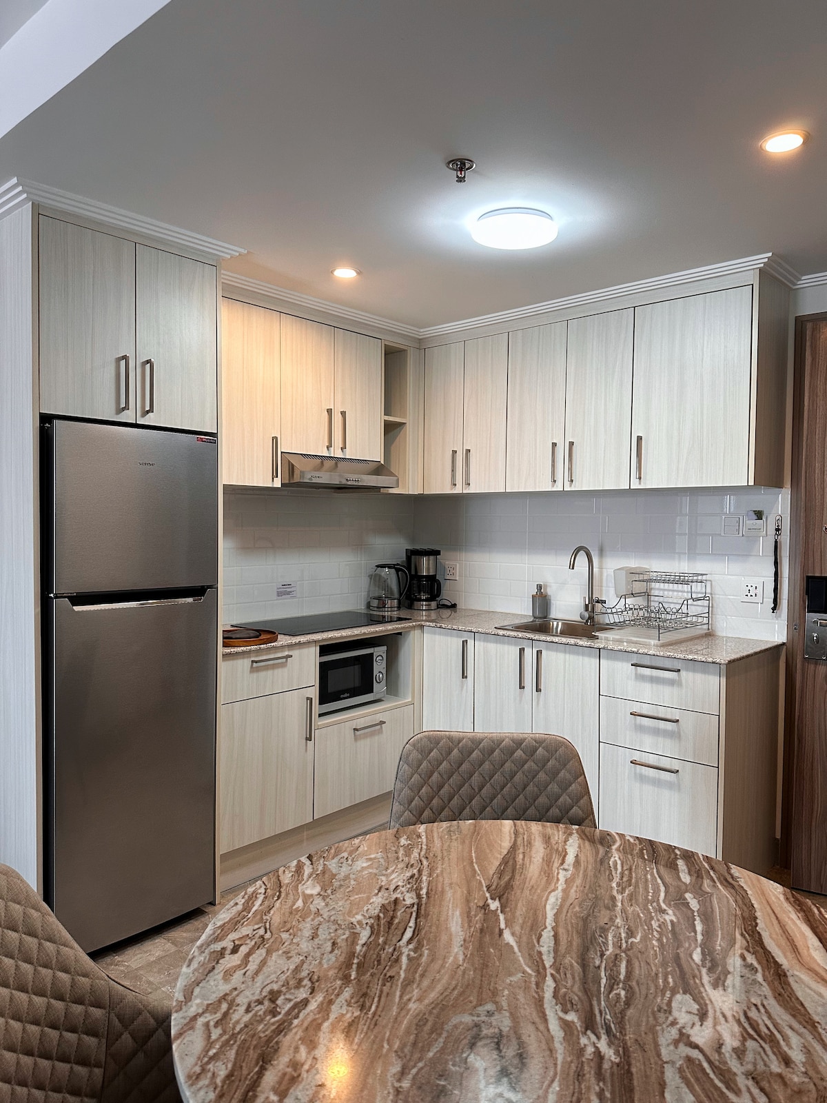 A 42-43 square meter Grand Studio unit that comes fully furnished and equipped with all necessary kitchen items, towels, and bed linens for your convenience. We also have our own filter tank where you can get drinking water right from the faucet. The furniture has been carefully chosen to provide you with the highest quality and comfort.