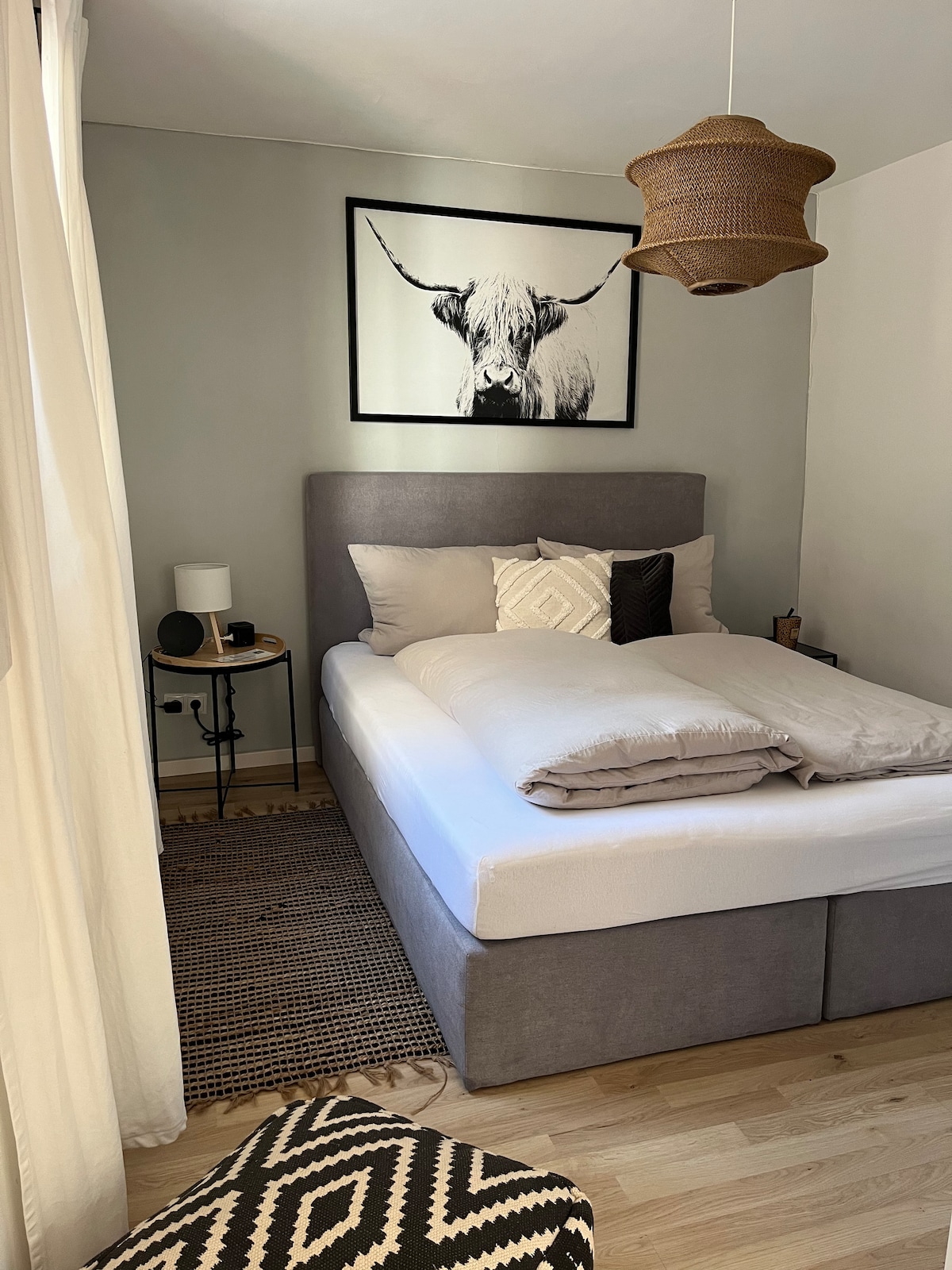 A stylish and comfortable apartment in the heart of Bamberg, freshly renovated. Quietly located on the ground floor of a charming old building on the square opposite the ETA Hoffmann Theater, within walking distance of all tourist attractions. Just a 2-minute walk to Lange Straße with shops and supermarkets. 1.2 km from the main train station. Fully equipped (washing machine, television, WiFi). There is also an inner courtyard where you can smoke and also park your bicycles.