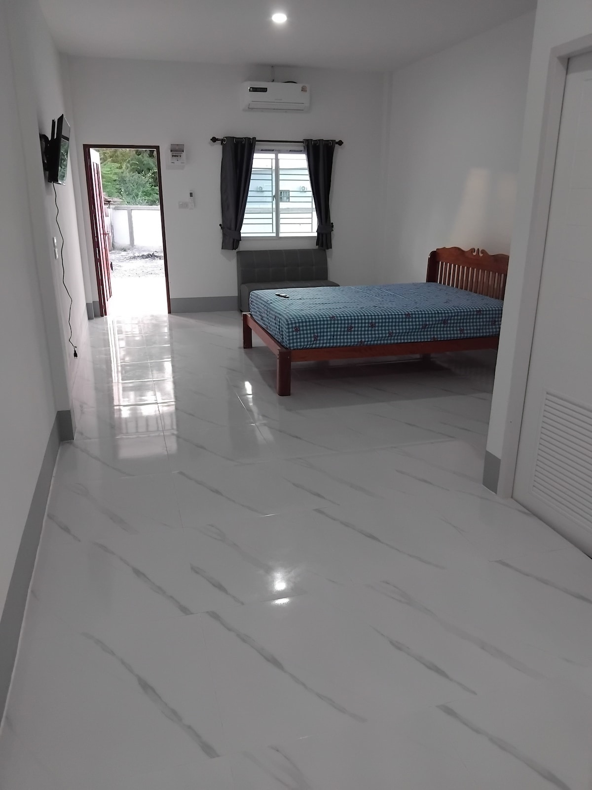 This newly constructed single-family residence is available for vacation rental in the heart of Buriram in the Mueang District, Village No. 18. The living/family room is spacious with an entertainment center, large sectional couch, futon, secondary dining space and work area. The living area leads to a full kitchen space. Two bedrooms feature queen beds and master bathrooms. The third bedroom has two twin beds. There is central air conditioning. Minutes from the water park, stadium, race track!