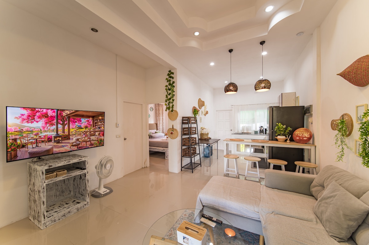 55 m² 🏡 with large living room, 2 bedrooms with A/C and king beds, veranda🌴 Easy accessible by car or scooter, free parking. In the❤️of Koh Phangan, only 2 mins drive from the beach, 5 mins from the center. Fully stocked and equipped kitchen⭐Free drinking water⭐ The area is so safe that you can leave the door open anytime. "Would recommend, very clean. Cannot complain and would stay again. Great communication from the host and very responsive to questions asked. Thank you very much :)"