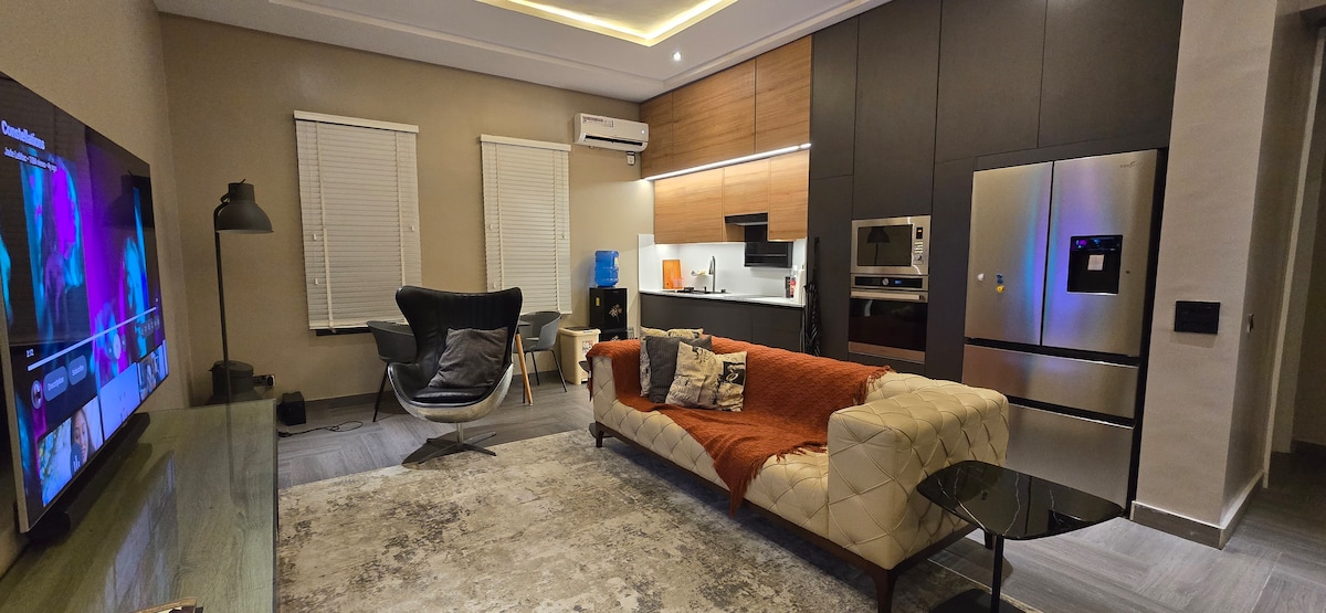 Welcome to our contemporary, cozy one-bedroom apartment “CAPRI”. “CAPRI” is located in the heart of Lekki Phase 1, precisely off Admiralty way. With its modern design and cozy atmosphere, this space is perfect for those seeking comfort and style. Enjoy an open layout filled with natural light, a fully equipped kitchen, and a stylish living area that invites relaxation. Conveniently situated near trendy cafes, shops, and the vibrant nightlife of Lekki phase 1, CAPRI is your ideal urban retreat.