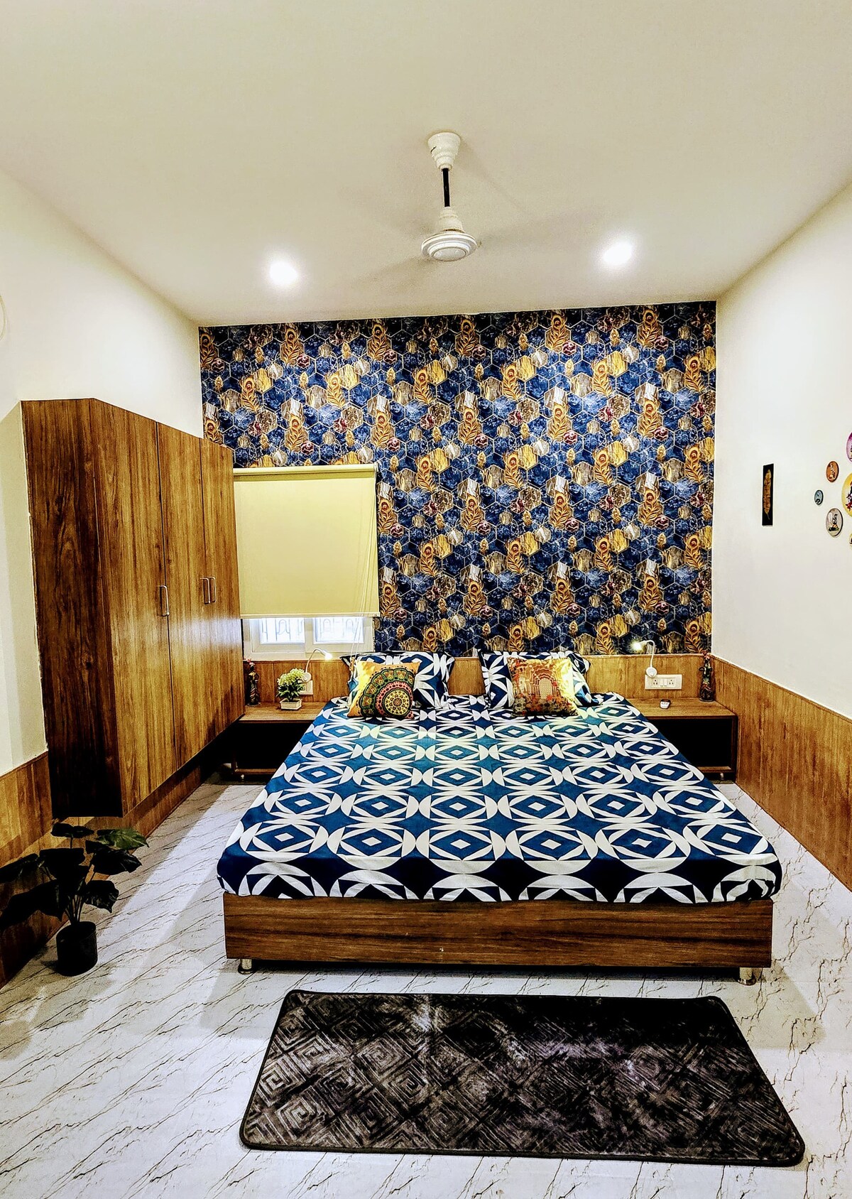 This 1st floor premium suite is based on Krishna theme. Its a fully loaded star class 390 sq ft Suite unit. This has 2 rooms, a full kitchen and can sleep 3 adults OR 2 adults and 2 kids. There is a huge terrace too and a parking. There are many restaurants and shops around. This place is centrally located and every place of importance is at a short distance and reachable in minutes. Through this AirBnB we support a community school for the needy children of our area as a part of this project.