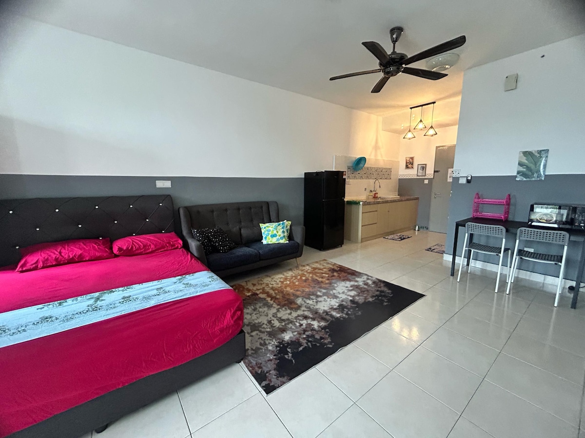 Explore our cozy studio, which can accommodate 2 to 3 people with a queen bed and a sofa bed. Only a 15-minute drive from KLIA T1/T2, the place is surrounded by many restaurants, fast food branches, groceries, and laundry shops, all within walking distance. Savor all the amenities, including the kids’ playground, BBQ area, gym, and swimming pool, with 24/7 security. * Unavailable drop your luggage before check in hours.Due to building designed, need to walk 10 steps staircase to get elevator.