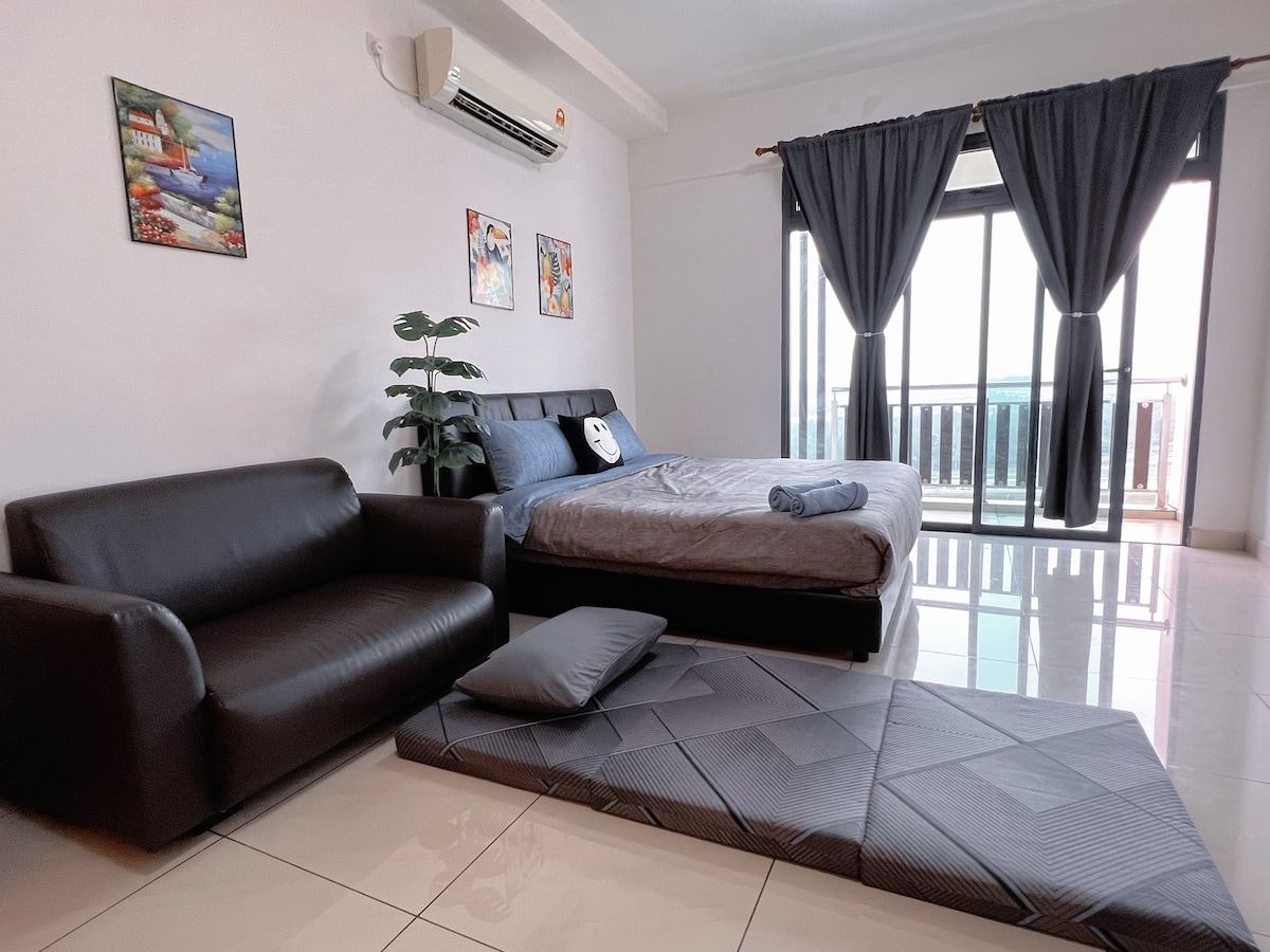 Fully furnished studio with 1 queen bed, 1 sofa bed and 1 matress. Possibility of simple cooking. More facilities than hotel room with lower price. Location just nearby shopping/dining paradise: AEON Tebrau, Capital21, Spring Labs, Mt Austin, Setia Indah, Johor Jaya. Taman Daya town with laundry service, McD, KFC, food court, ATM and banks within walking distance about 1km. WIFI, refrigerator, microwave, washing machine and more are provided.