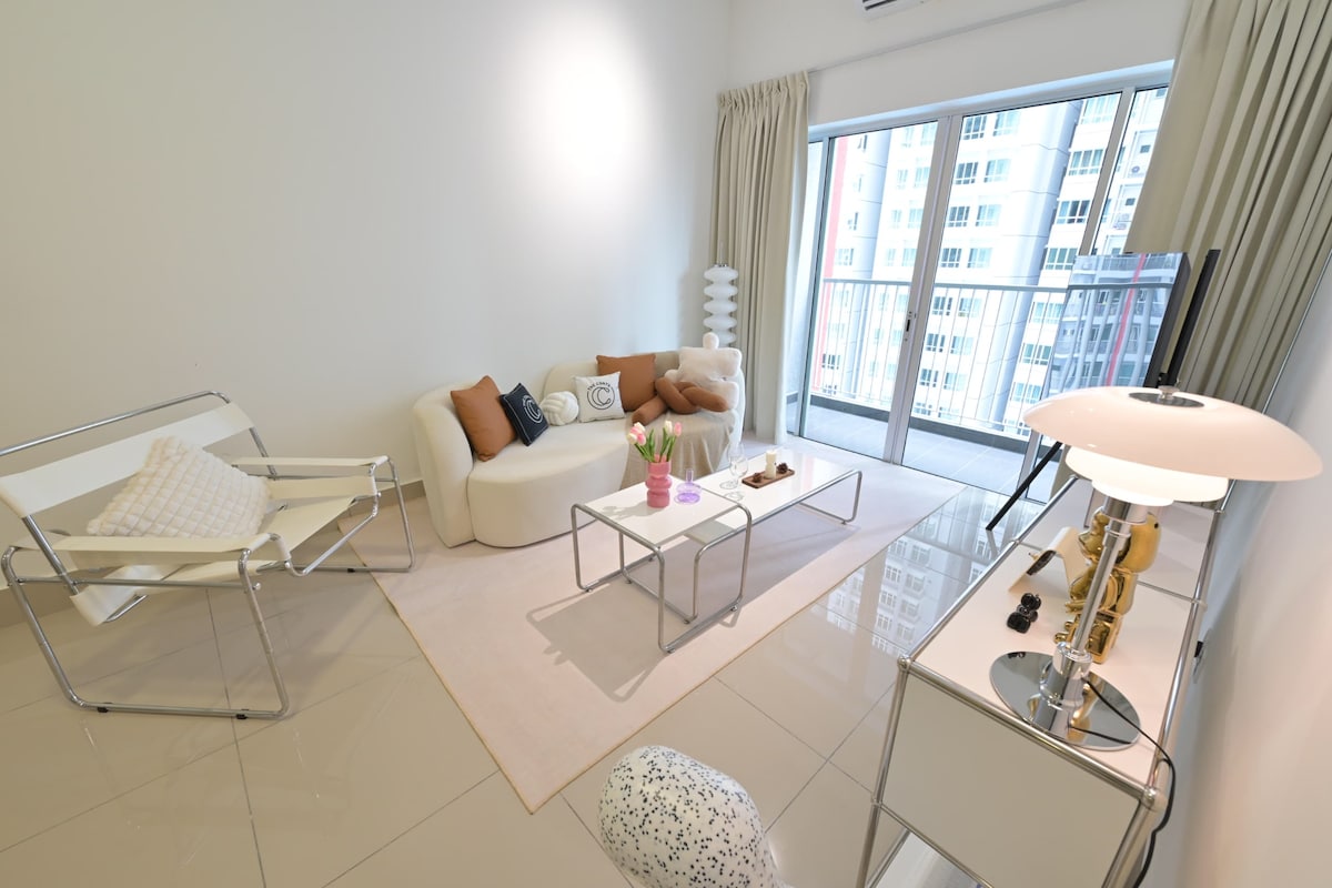 Sit back and relax in this calm, stylish space. Why Seashell suite at Lucentia Residence - Best views of KL - Beautifully decorated with a fun spirit - Centrally located & attached to public transit hub - Fast wifi - 2 TVs with Netflix & others - 2 gorgeous pools - Family friendly with baby crib & highchair - Gym, pool table, BBQ pits, piano - Garage parking - Recommended to Sleeps 6, max 8 person - LaLaPort Shopping Mall & the WOW entertainment street are attached - Grocery, drug store & Cinema