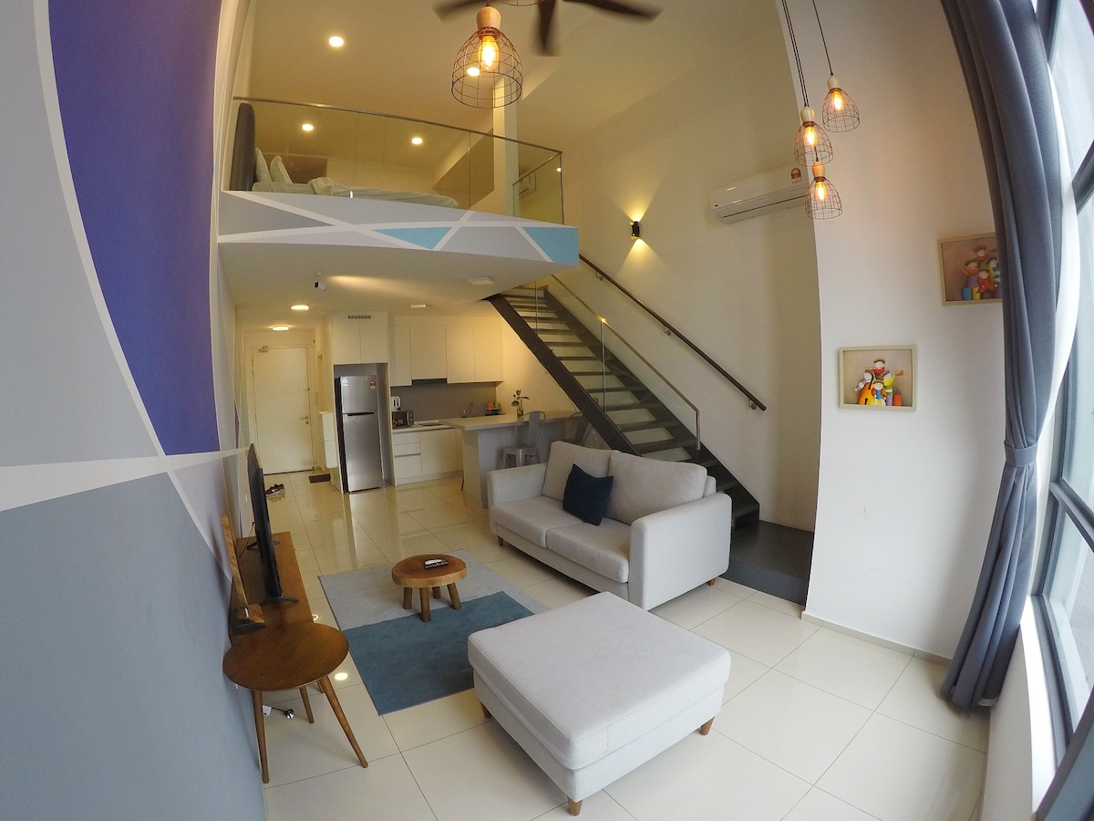 Our Grand Loft is packed with all sorts of amenities and facilities that you'll ever need! We are furnished with premium quality furnitures , entertainment unit (Karaoke) and exquisite finishing that gives not only more value but also your experience staying here. We are located just 15 minutes away from the CBD, 5 stops away from Bukit Bintang (Pavillion) & 6 stops away from KLCC by train. We are strategically located with a 4 minutes covered walk through the mall to the MRT station at lv 1