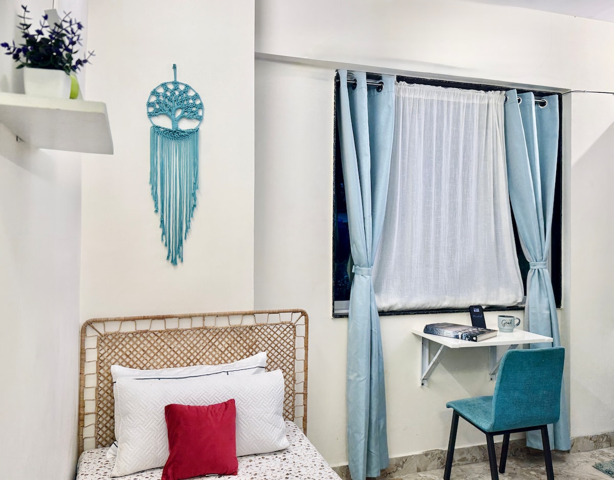 Located in a bustling yet calm locality … our place is just a minute walk from the well known lively Carter road and 5 minutes to many of well known cafes International airport is 10 kms away Located on 3rd floor in a building with elevator and 24 hours security Hosted by a couple staying right next door , guests will have their own private access to their area including en-suite room and kitchen FOR SINGLE LADY ONLY Wardrobe Study table Comfortable single bed with orthopaedic mattress