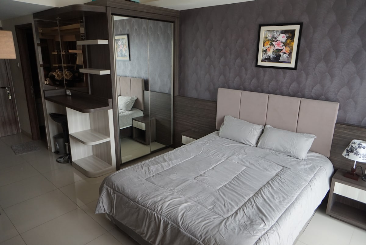 Located in the center of Bandung city, our apartment is flanked by 2 big malls, BIP Mall & BEC Mall, very easy to get anything on a walking distance. You will enjoy the sunset of Bandung city at a height of 21st floor Free Fast WiFi, with 55 Inch 4K Smart TV, with Premium membership of Netflix, Disney+, HBO Max, IQIYI, Viu You will sleep on a King Size, King Koil mattress, plus 2 extra floor mats Kindly note that parking —both for motorcycles and cars— is cashless only