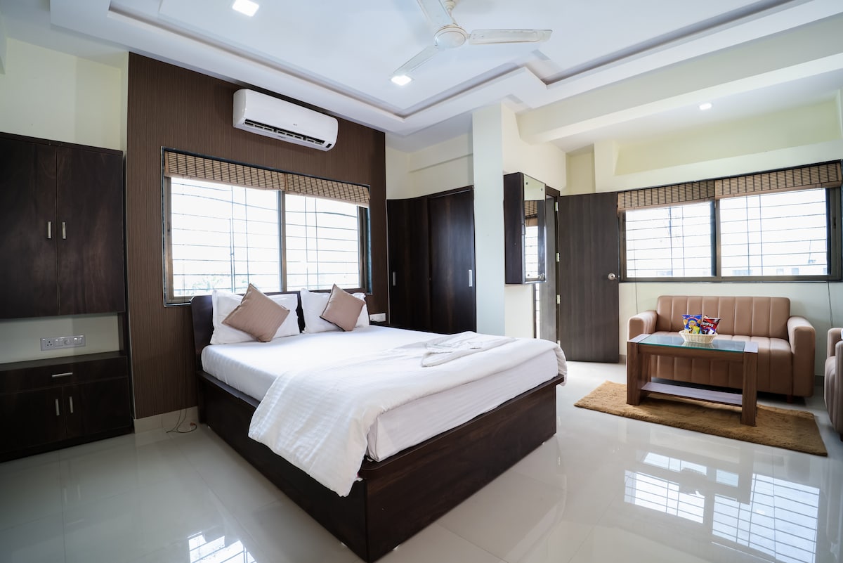 Welcome to Executive Haven, a thoughtfully designed room perfect for business travelers and professionals. Located in a modern building that also features a boutique hotel and 2BHK serviced apartments, this private stay offers comfort, convenience, and privacy. Enjoy high-speed WiFi, a work desk, smart TV, and a peaceful environment. Just minutes from top corporate offices, dining spots, and city attractions. ✅ Fast WiFi ✅ Central Location ✅ Hassle-Free Check-In