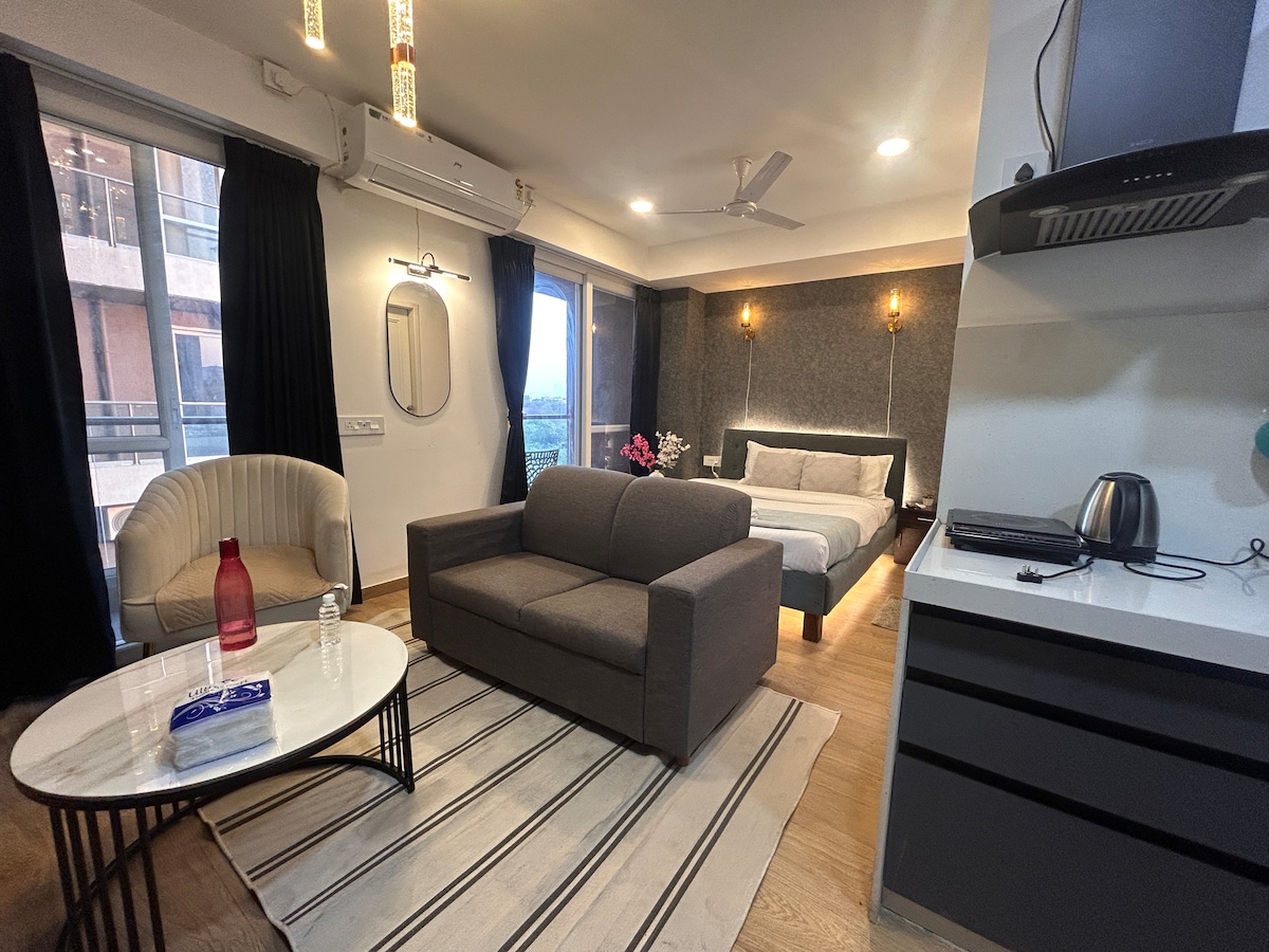 Come experience golden hour like never before—your perfect stay awaits! Your peaceful escape in the city! This thoughtfully designed 1BHK in 400sq foot offers a perfect blend of comfort and calm, with warm interiors and a magical sunset view that lights up your evenings. Whether you're sipping chai on the balcony or unwinding in the cozy living area, every corner of this home is curated to bring you serenity and joy.