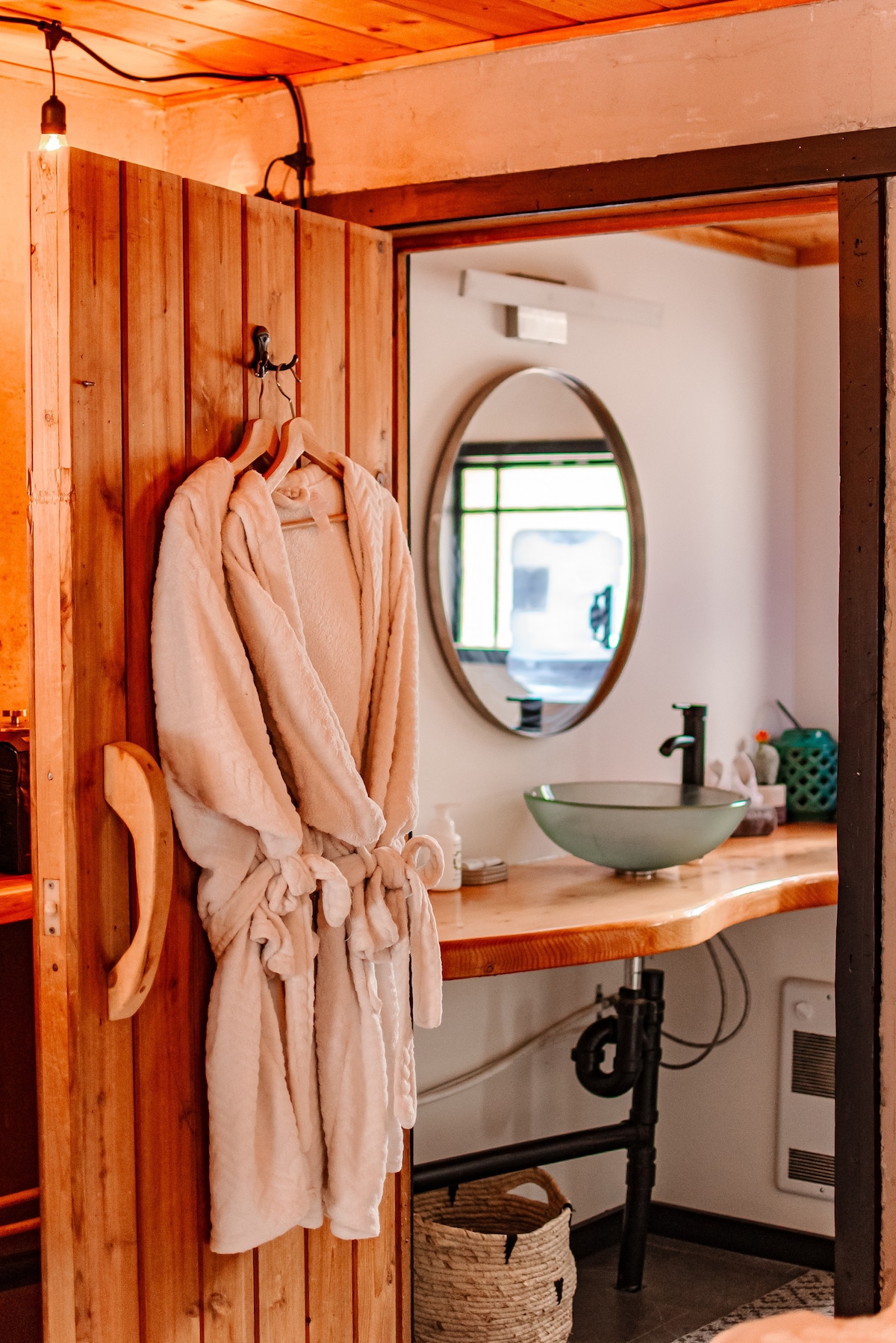 Escape to Mountain Bliss Unwind in a cozy cabin nestled amongst the trees. Soak in breathtaking mountain views from the deck, relax in the hot tub, or unwind in the unique treehouse sauna. Feel a world away, yet conveniently located: -6 minutes from downtown Golden -20 minutes from Kicking Horse ski resort -Day trips to Yoho, Glacier, Banff, and Bugaboo National Parks Features: King bed and comfy couch Full kitchen to whip up delicious meals Spacious deck Hot tub and sauna Fast WiFi BBQ