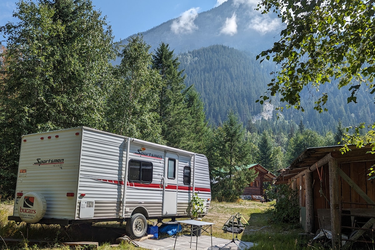 Come enjoy this clean, private and spacious fully serviced (water/power/sewer) 27ft RV trailer situated 5km south of Golden in Habart neighborhood. There is a covered deck with a BBQ and side burner to enjoy outdoor cooking and keep you dry when it's raining, lots of parking space and everything you need to spend some good times in town. Close to hiking/biking trails, footsteps to the Columbia River there is no shortage of activities around.
