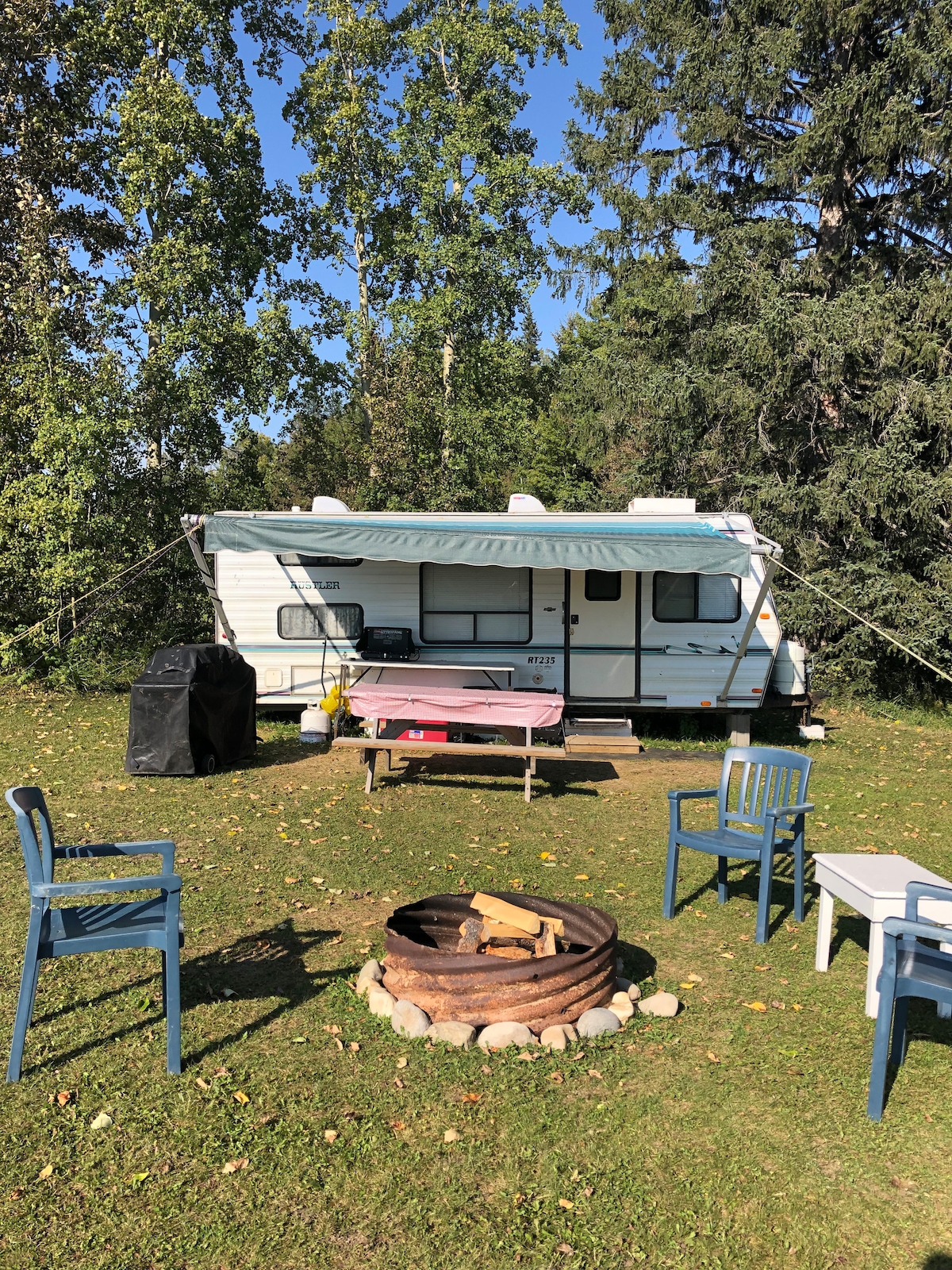 This is our travel trailer setup in one of the best campsites we have. We call it glamping.. perfect for those wanting to camp but not "rough it". You will need firewood for the firepit.