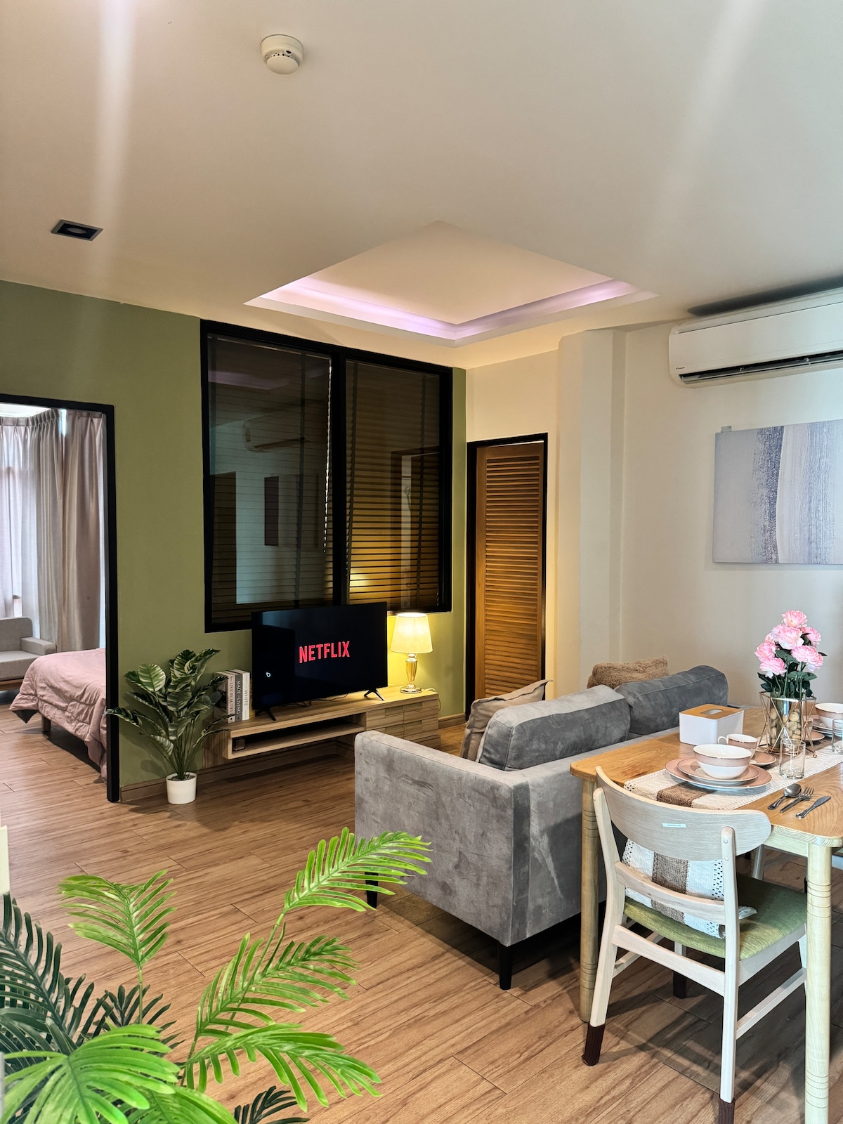 Spacious 62sqm pet-friendly suite, featuring a large balcony! Designed with an open living space that includes a smart TV, working area, 4-seat dining table, and fully equipped kitchen. The bedroom boasts a king-sized bed, another smart TV, powder area, and walk-in closet for your comfort. Both the living and bedroom provide access to the 4-fixture bathroom, which includes a relaxing bathtub and shower.Enjoy amenities such as swimming pool, gym and complimentary shuttle service during your stay!